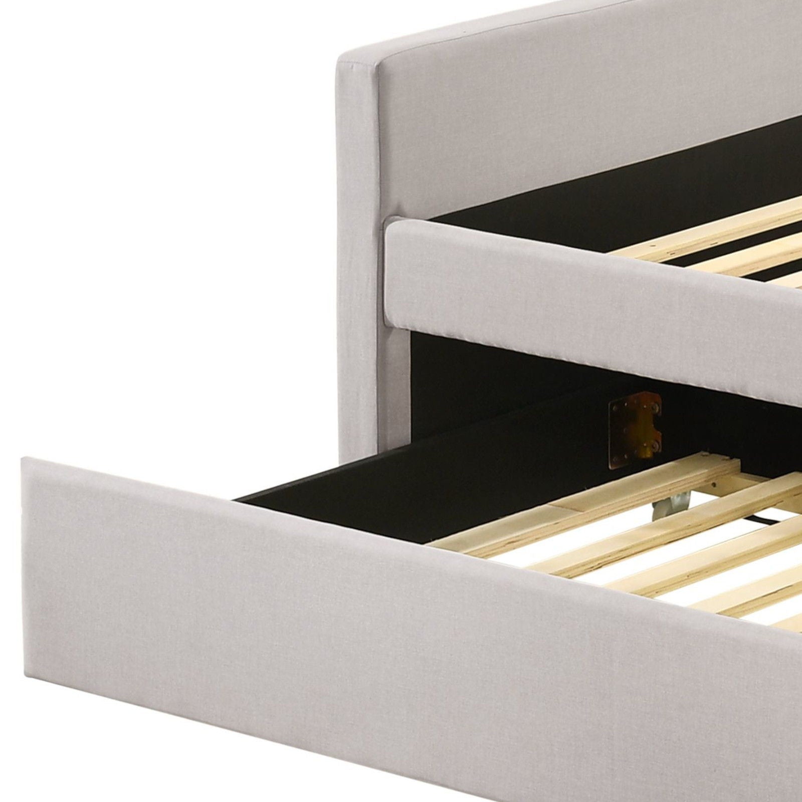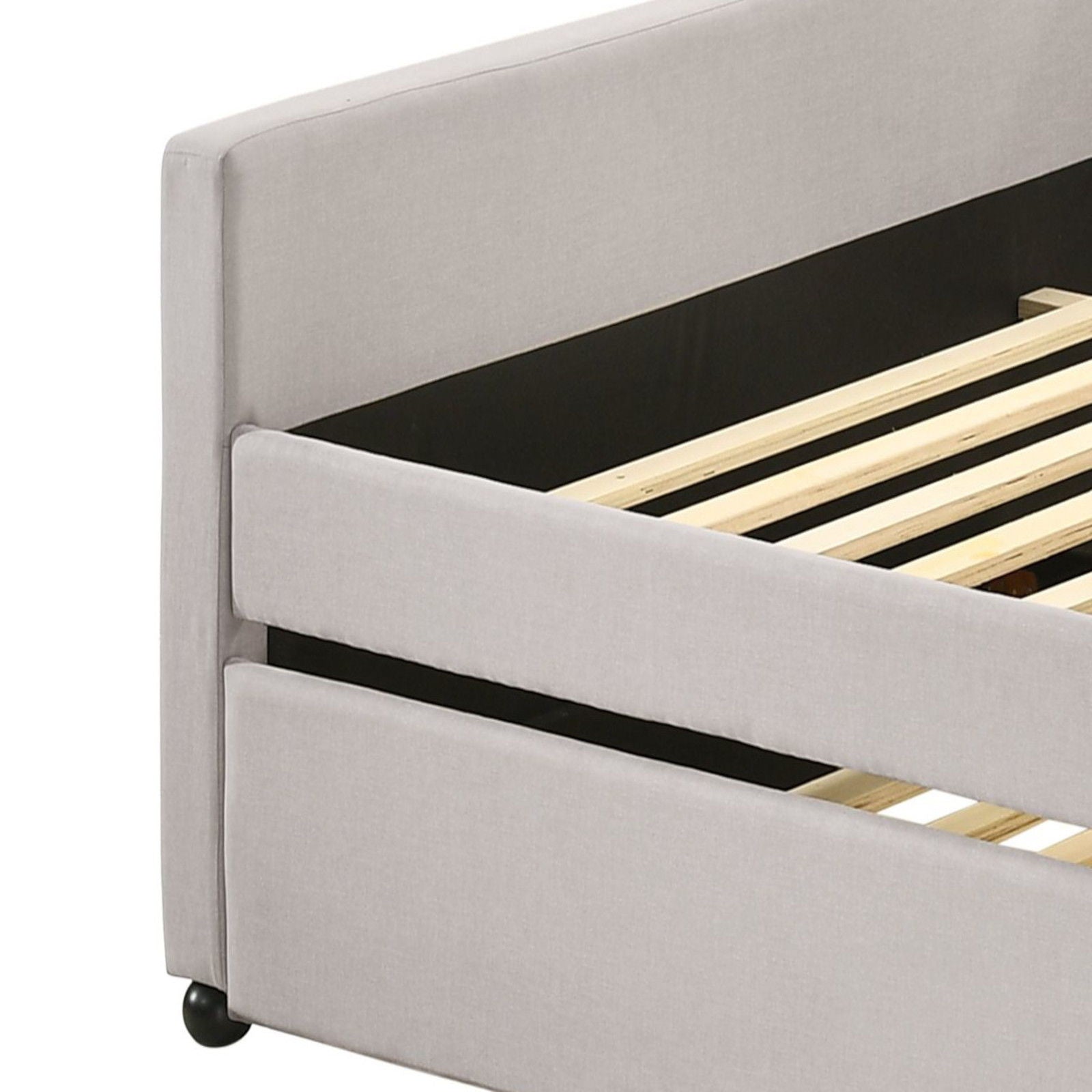 - Design and Features: This daybed includes a slat system, a trundle for additional sleeping space, and is fully upholstered with a button-tufted design. It features solid wooden legs and a sloped shape for added texture and style.