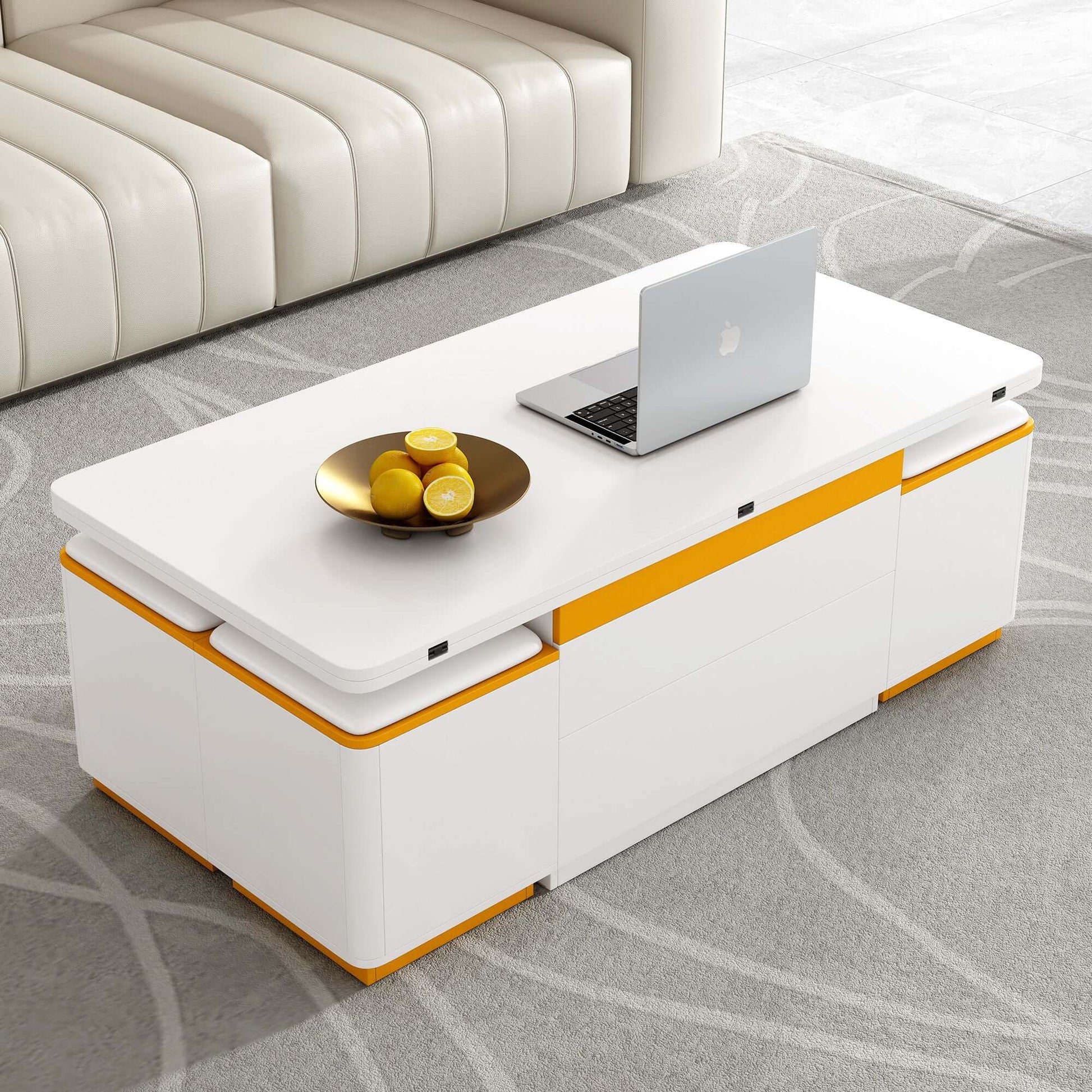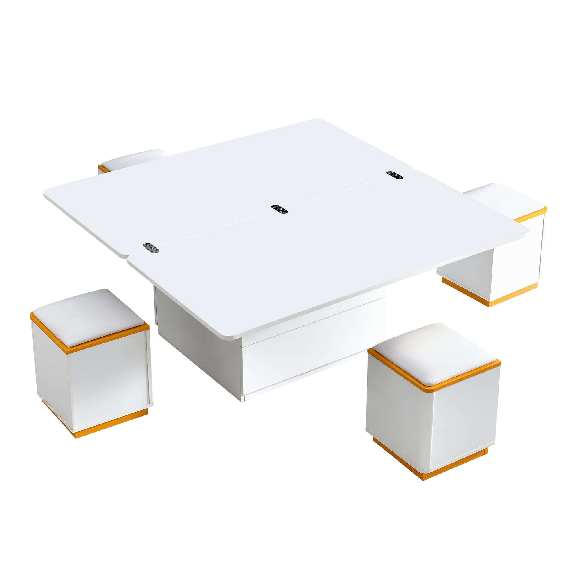 Lift Top Coffee Table With 4 Storage Stools, Foldable Top - White