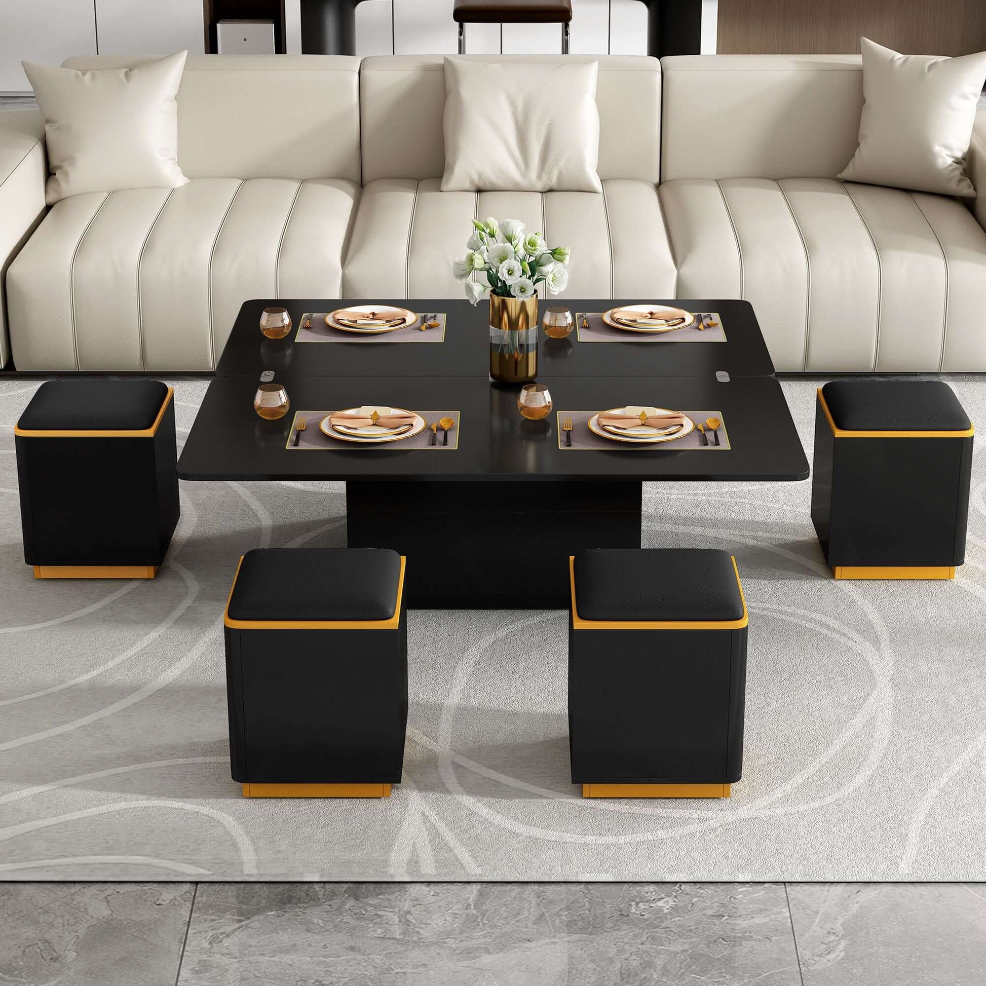 Lift Top Coffee Table With 4 Storage Stools, Foldable Top - Black