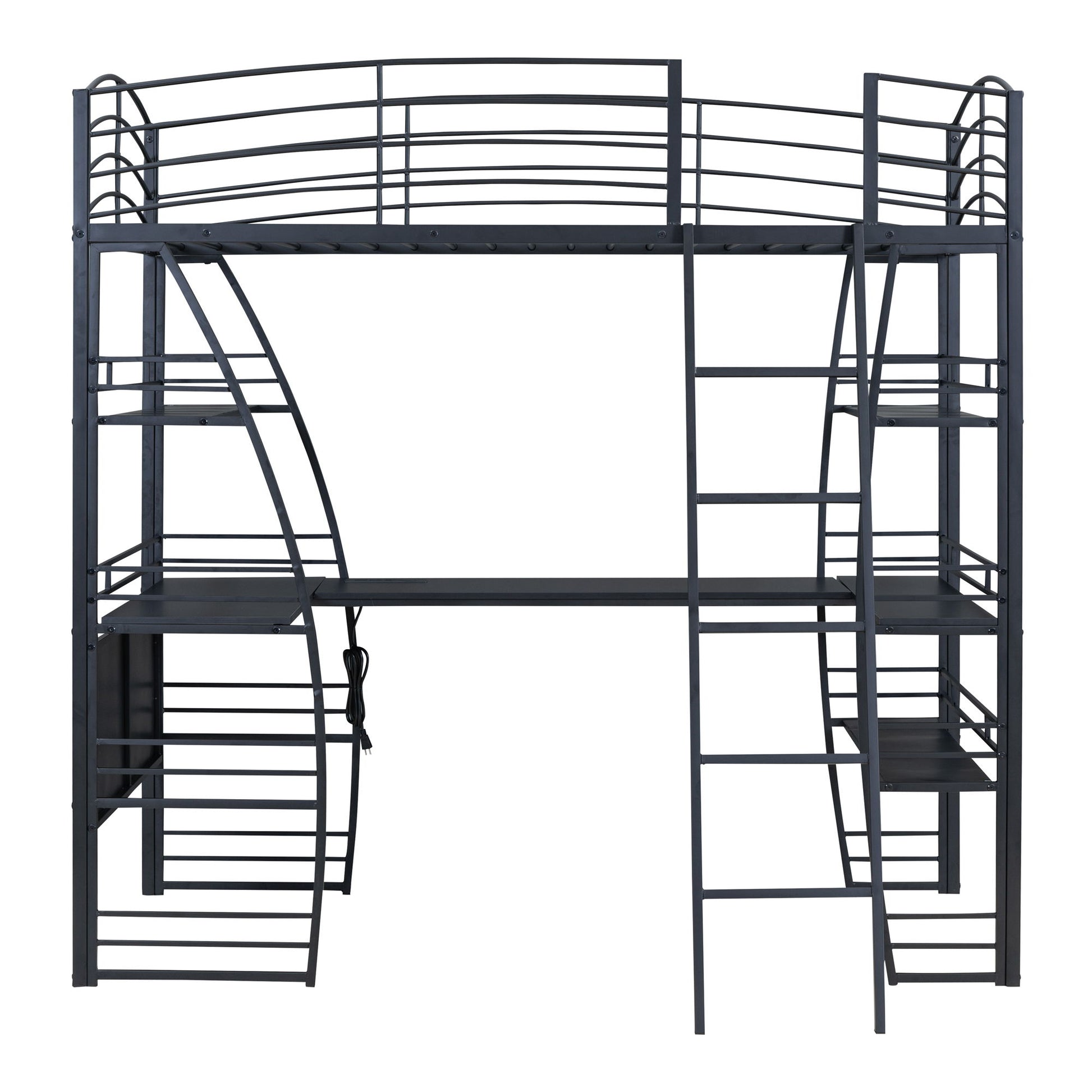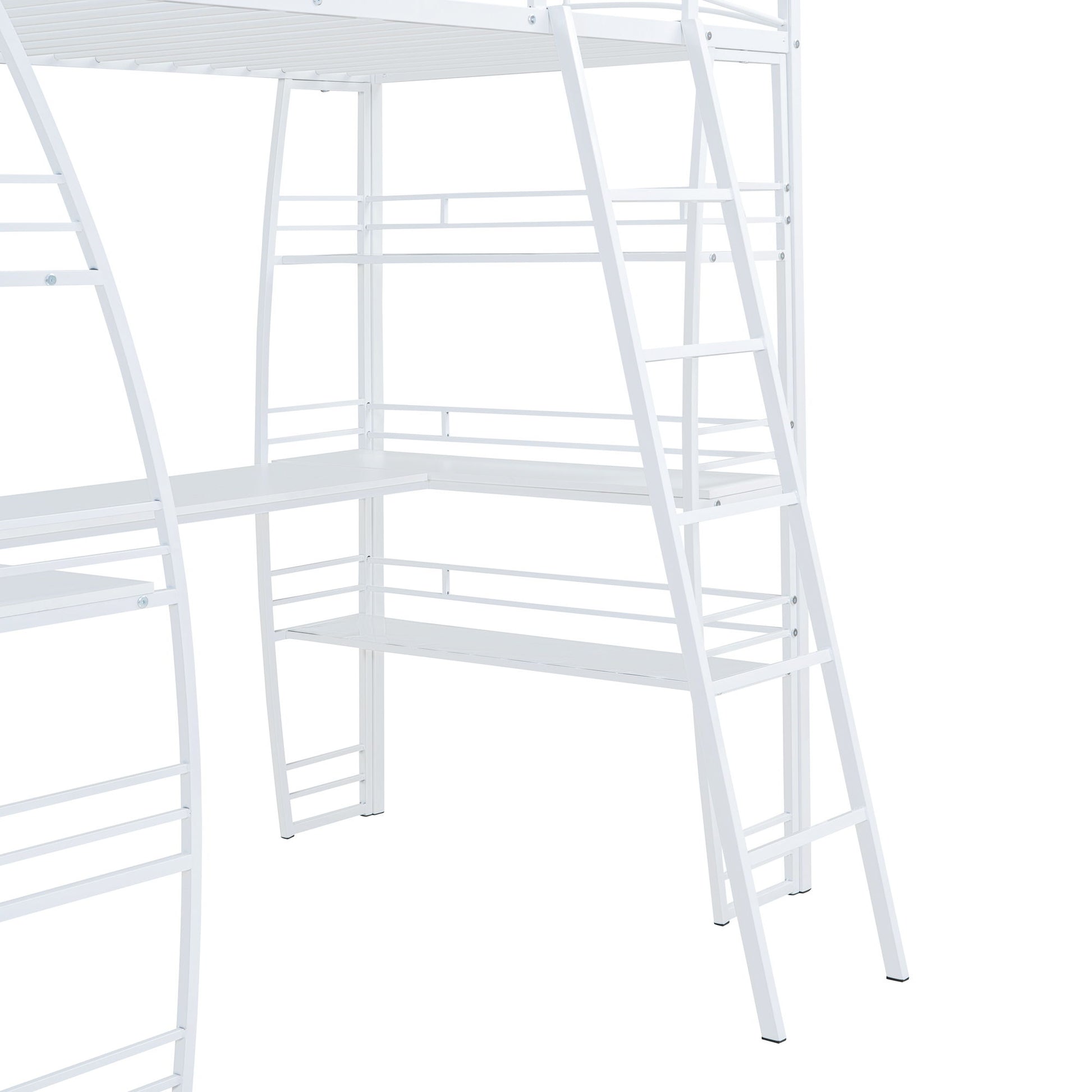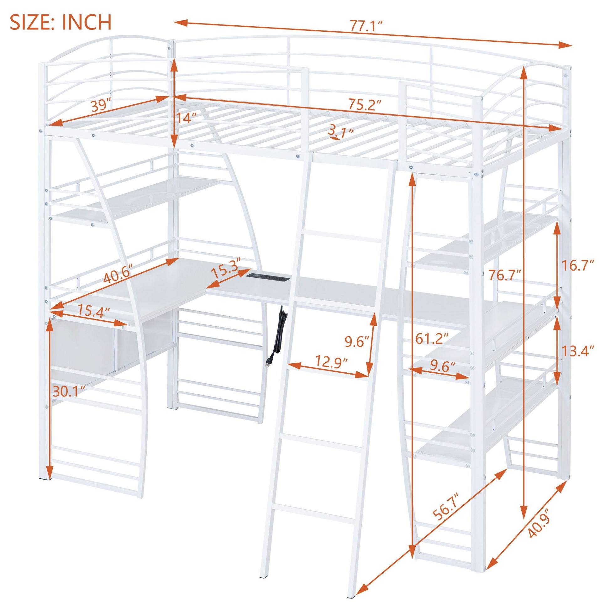 Crafted from metal with a clean painted finish, this metal loft bed strikes a clean-lined silhouette with curved slatted guardrails. This bold and imaginative design easily captures attention and complements your room decor. The four-layer open shelves offer ample space to display whatever you want, including lamps, books, and toys. For your convenience, a set of sockets, USB ports, and wireless charging is equipped on the desk, saving you the hassle of charging your phone and tablet while you work or read. Equipped with a large L-shaped desk, this bed provides a comfortable place to work, read, and enjoy yourself. I am sure that this imaginative loft bed can create your little wonderful world.