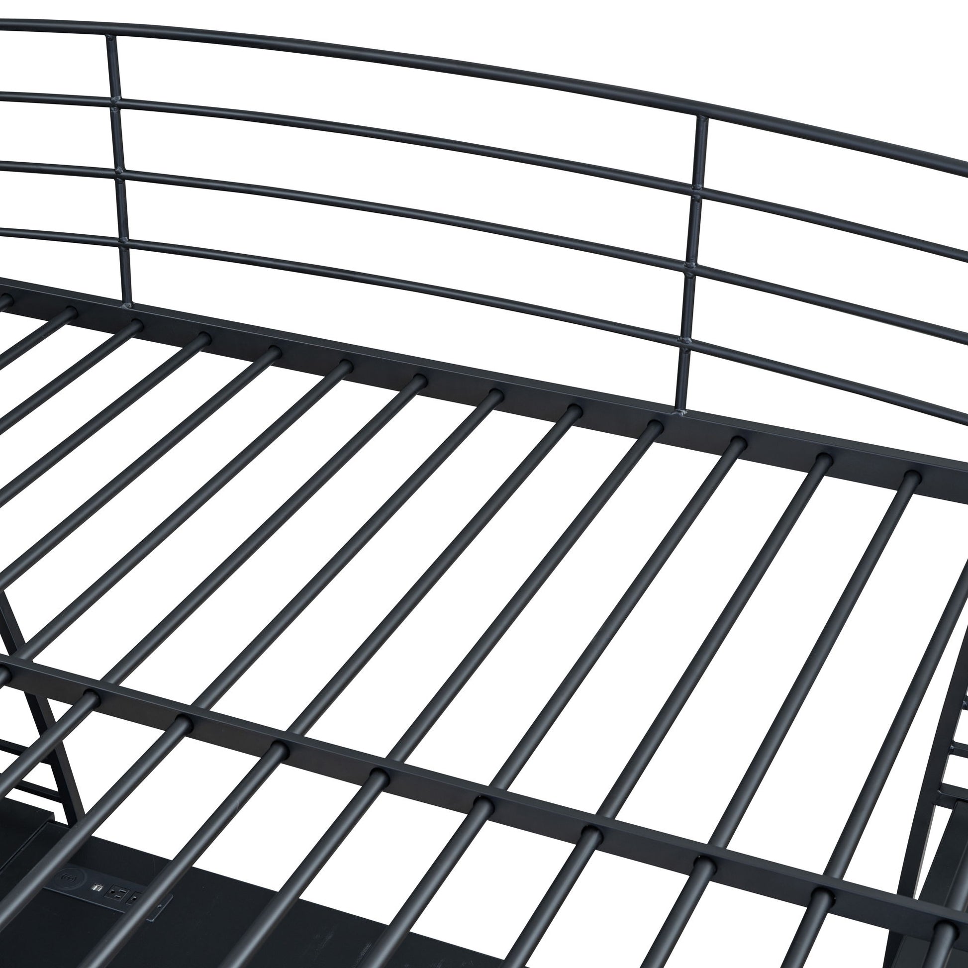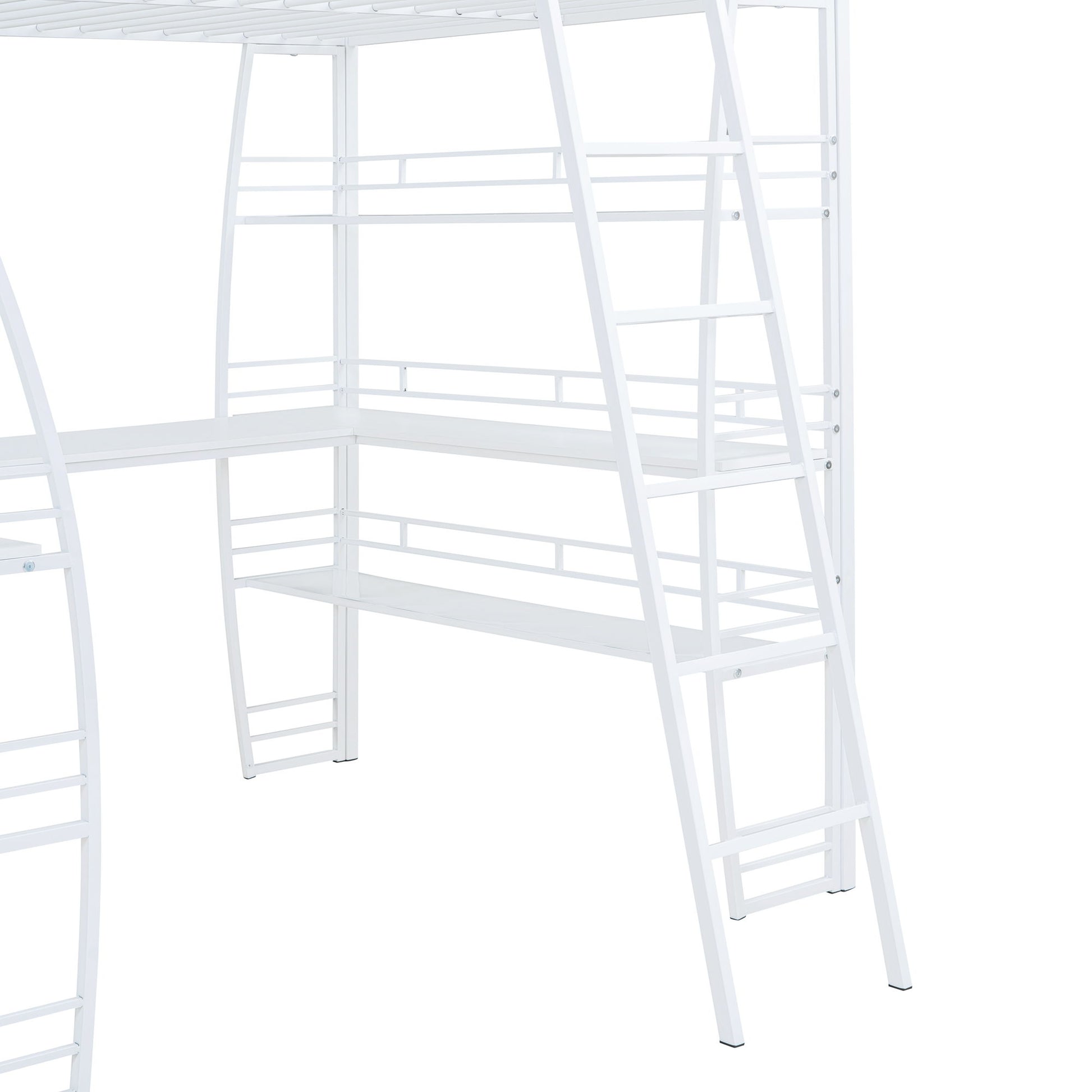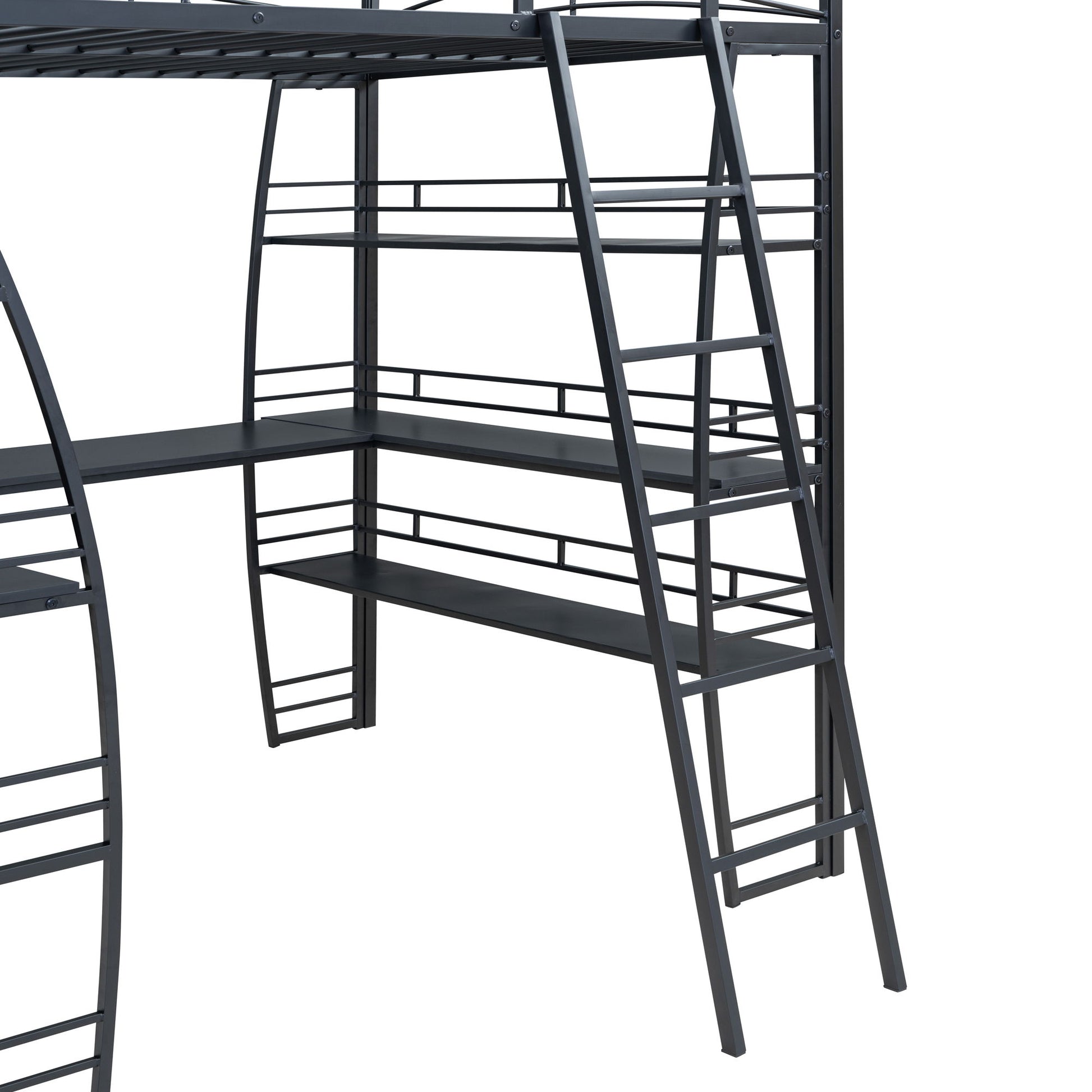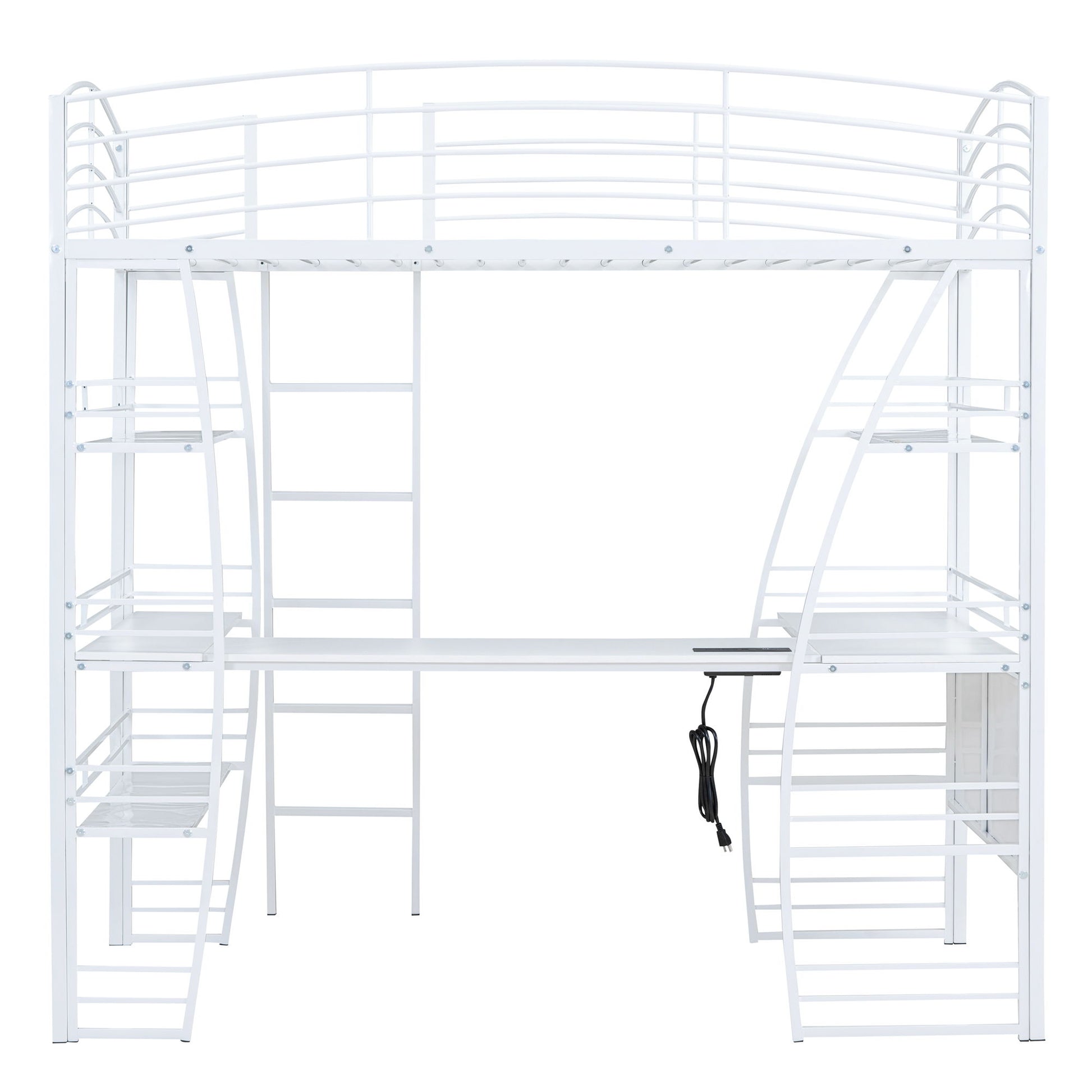Crafted from metal with a clean painted finish, this metal loft bed strikes a clean-lined silhouette with curved slatted guardrails. This bold and imaginative design easily captures attention and complements your room decor. The four-layer open shelves offer ample space to display whatever you want, including lamps, books, and toys. For your convenience, a set of sockets, USB ports, and wireless charging is equipped on the desk, saving you the hassle of charging your phone and tablet while you work or read. Equipped with a large L-shaped desk, this bed provides a comfortable place to work, read, and enjoy yourself. I am sure that this imaginative loft bed can create your little wonderful world.