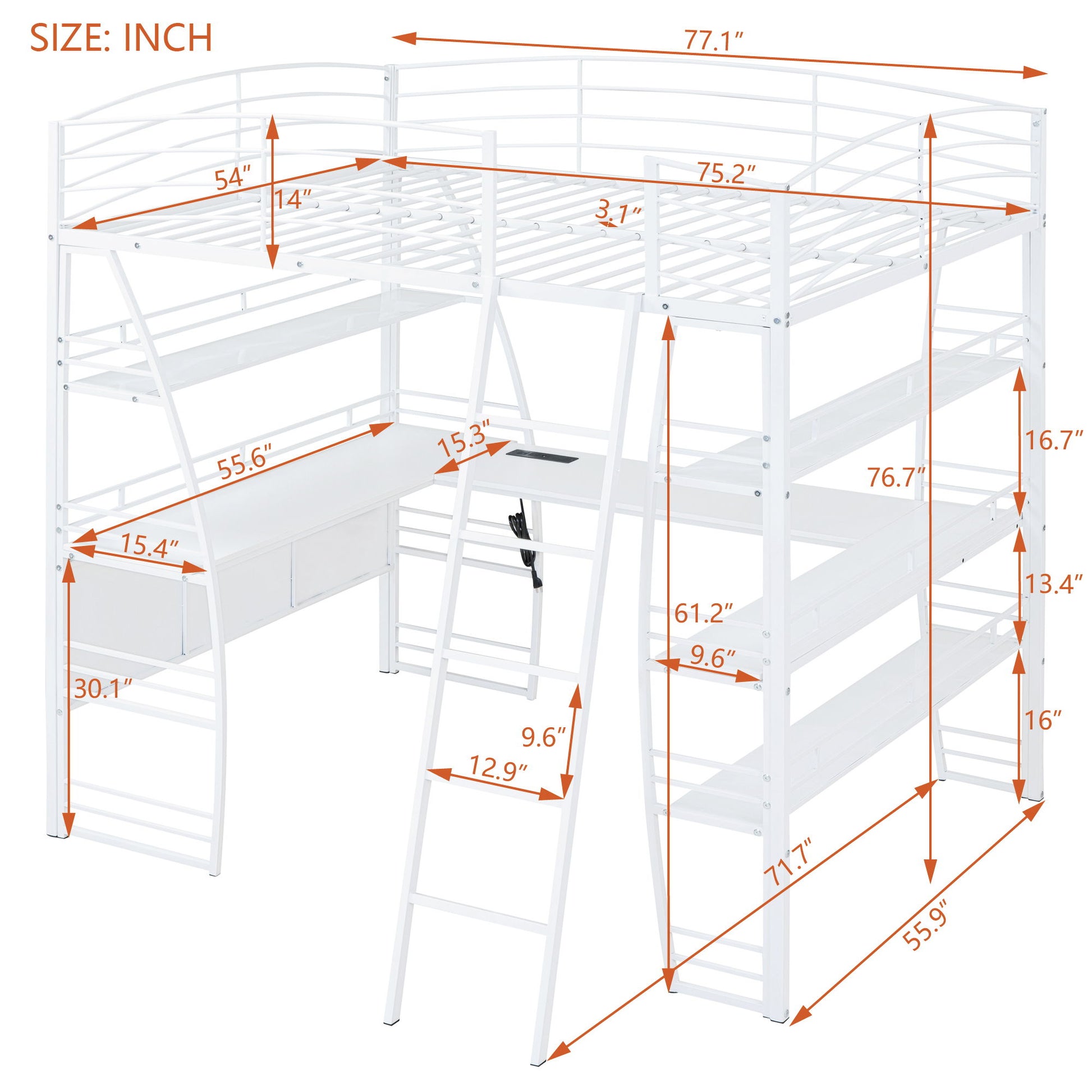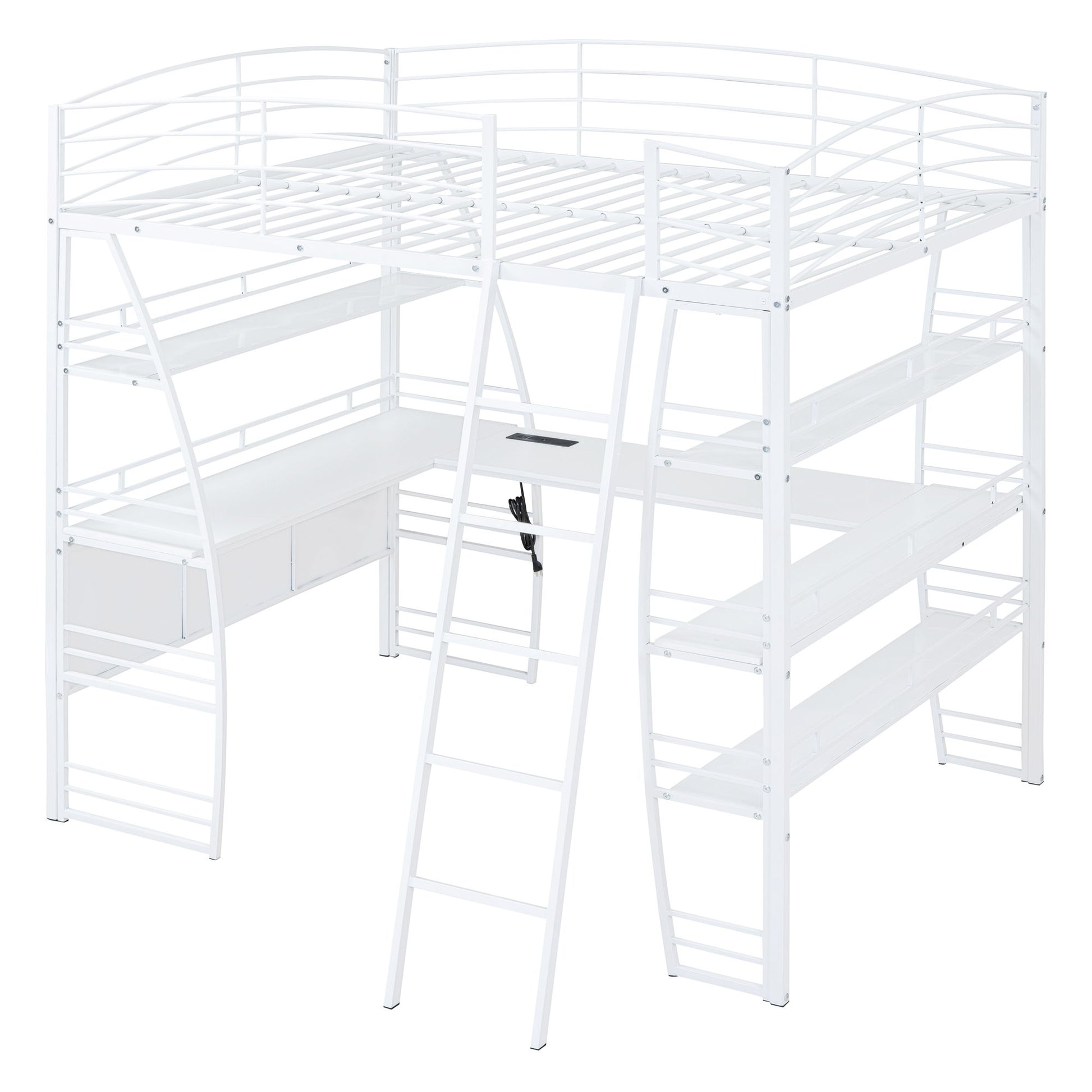 Full Size Loft Bed With 4 Layers Of Shelves And L-Shaped Desk, Stylish Frame With A Set Of Sockets, USB Ports And And Wireless Charging - White
