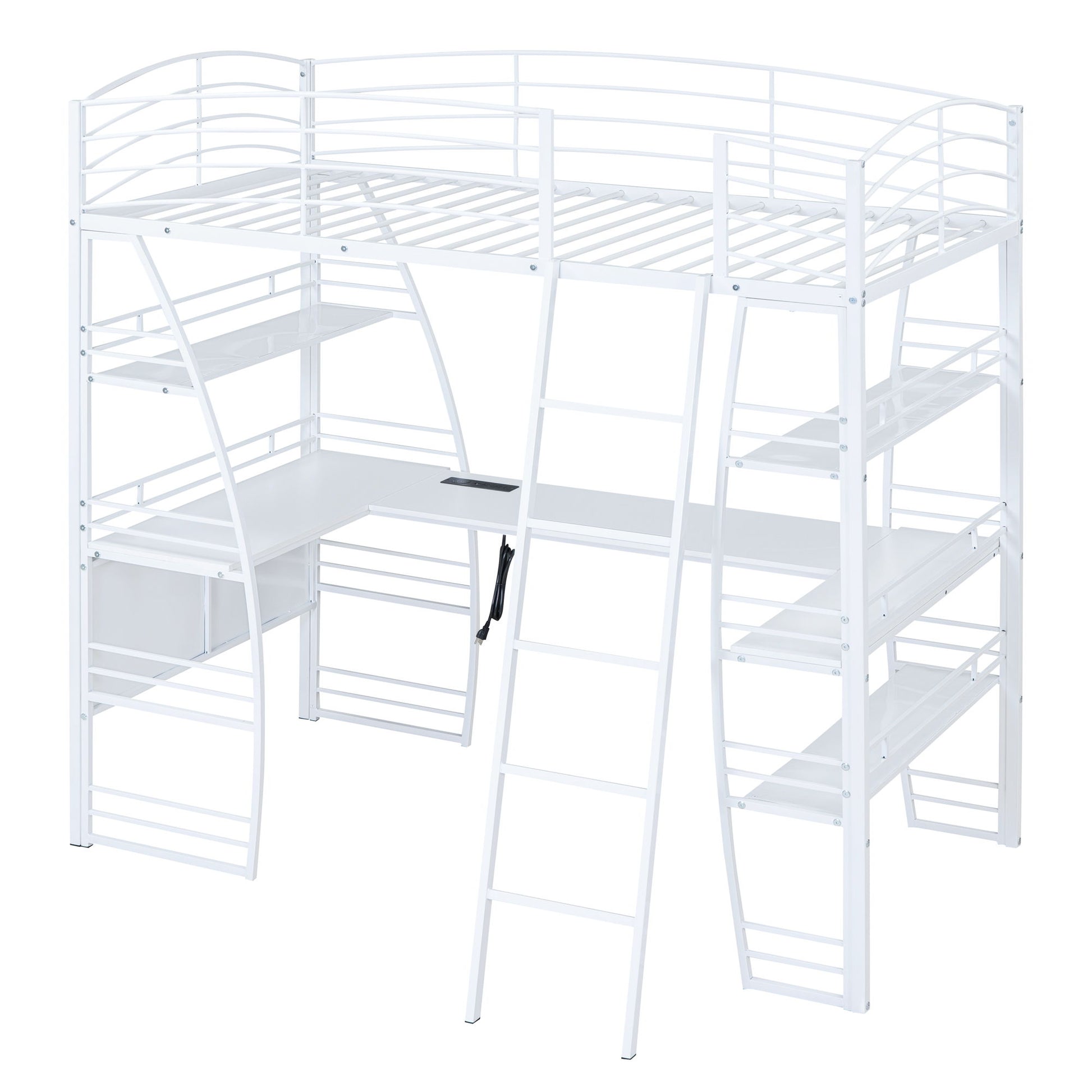 Twin Size Loft Bed With 4 Layers Of Shelves And L-Shaped Desk, Stylish Frame With A Set Of Sockets, USB Ports And And Wireless Charging - White