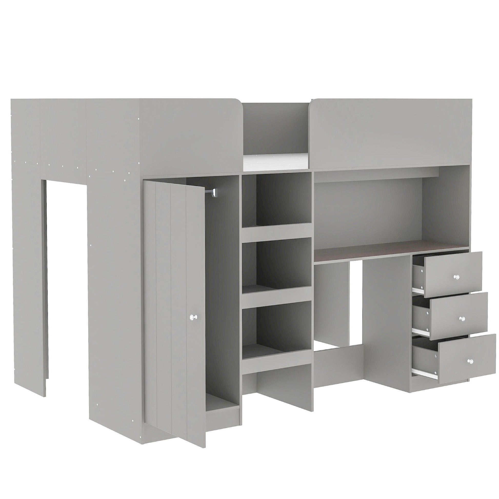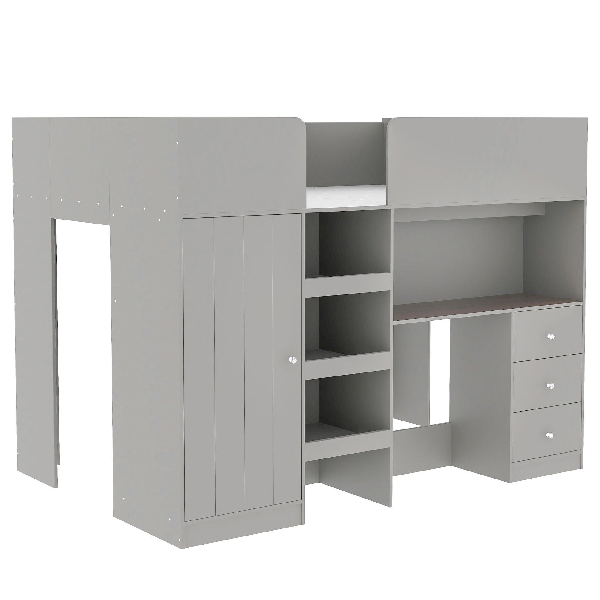 Full Size Loft Bed With Built In Wardrobe, Desk, Shelves, And Drawers - Gray