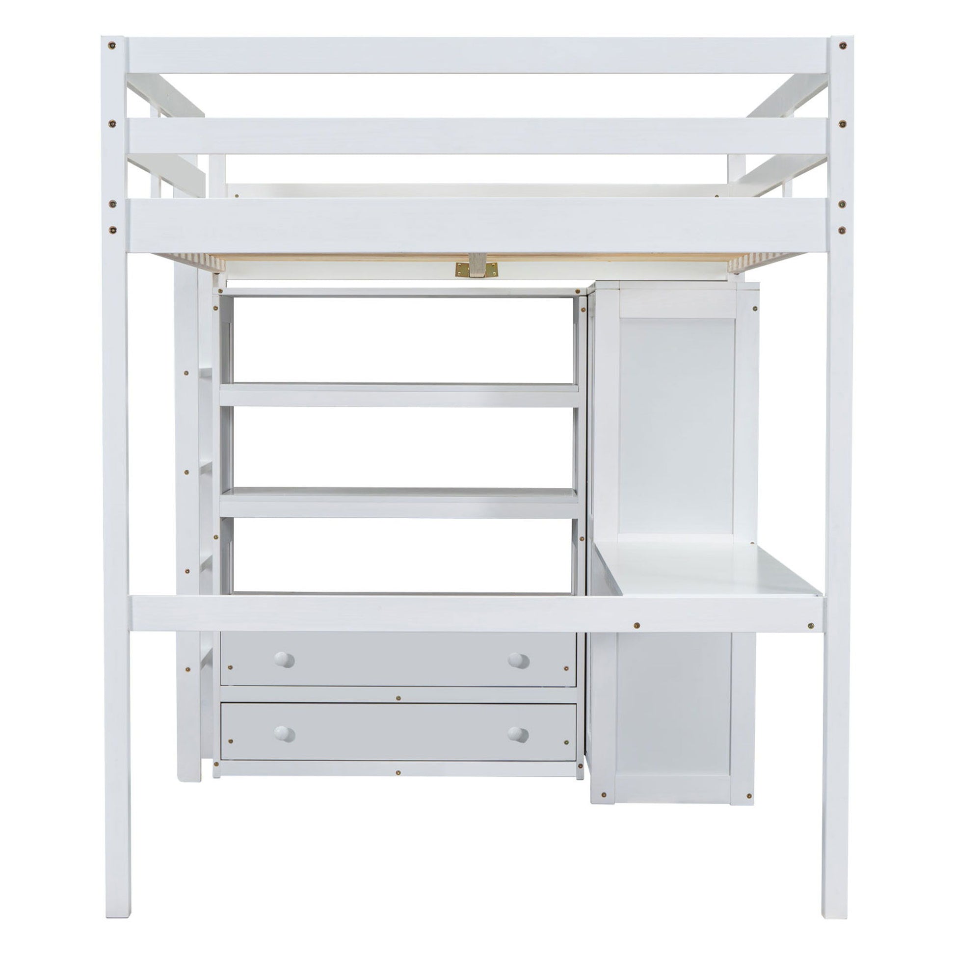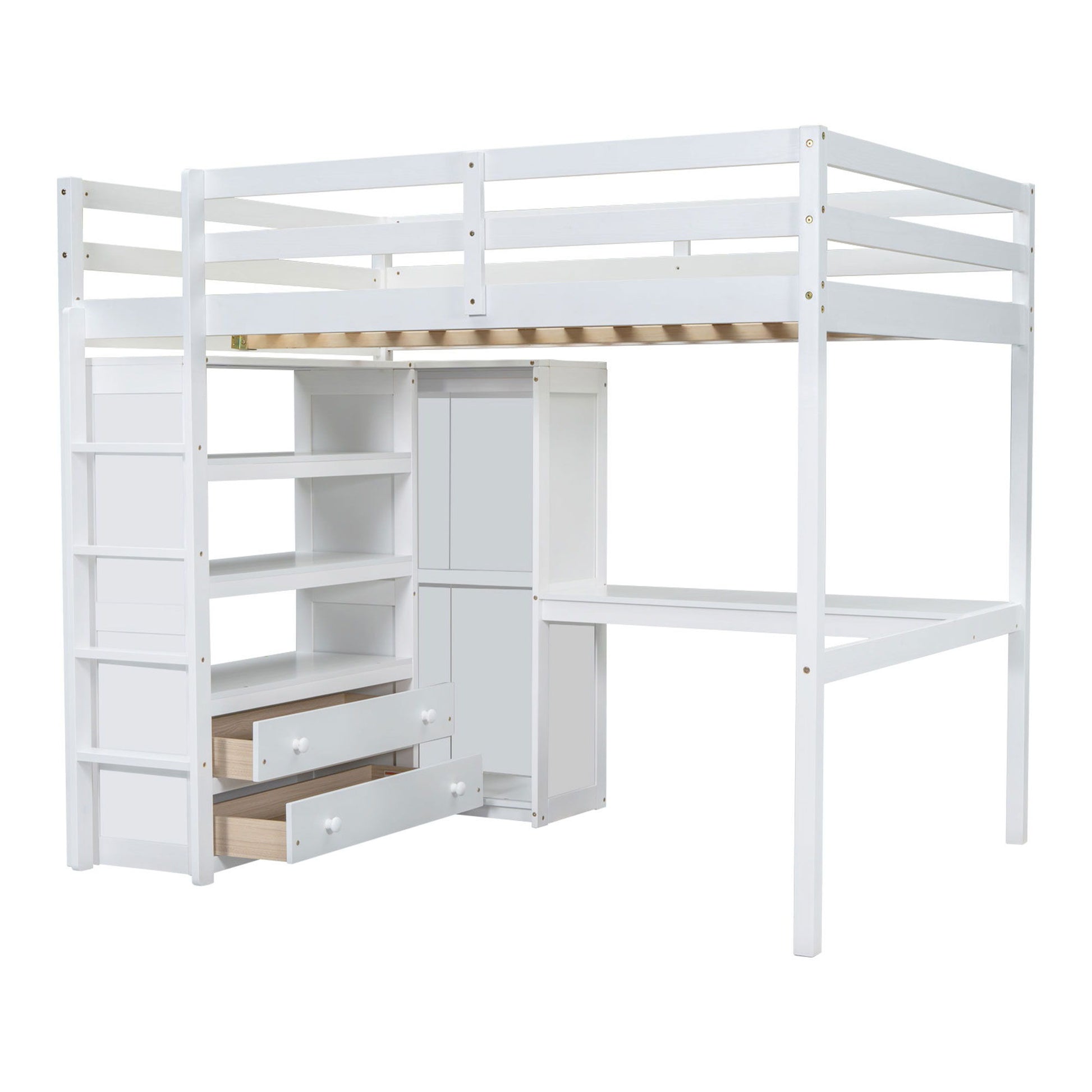 Full Size Loft Bed & Built In Wardrobe, Desk, Shelves, And Drawers - White