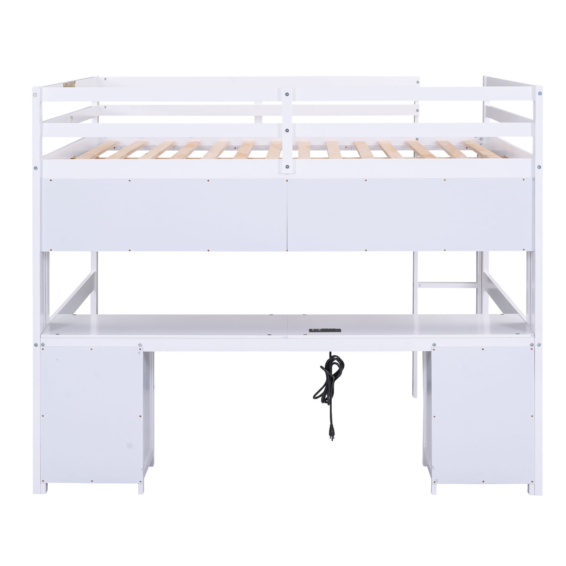Full Size Loft Bed With Built In Desk, Storage Cabinets, Drawers, Charging Station, And Bedside Tray - White