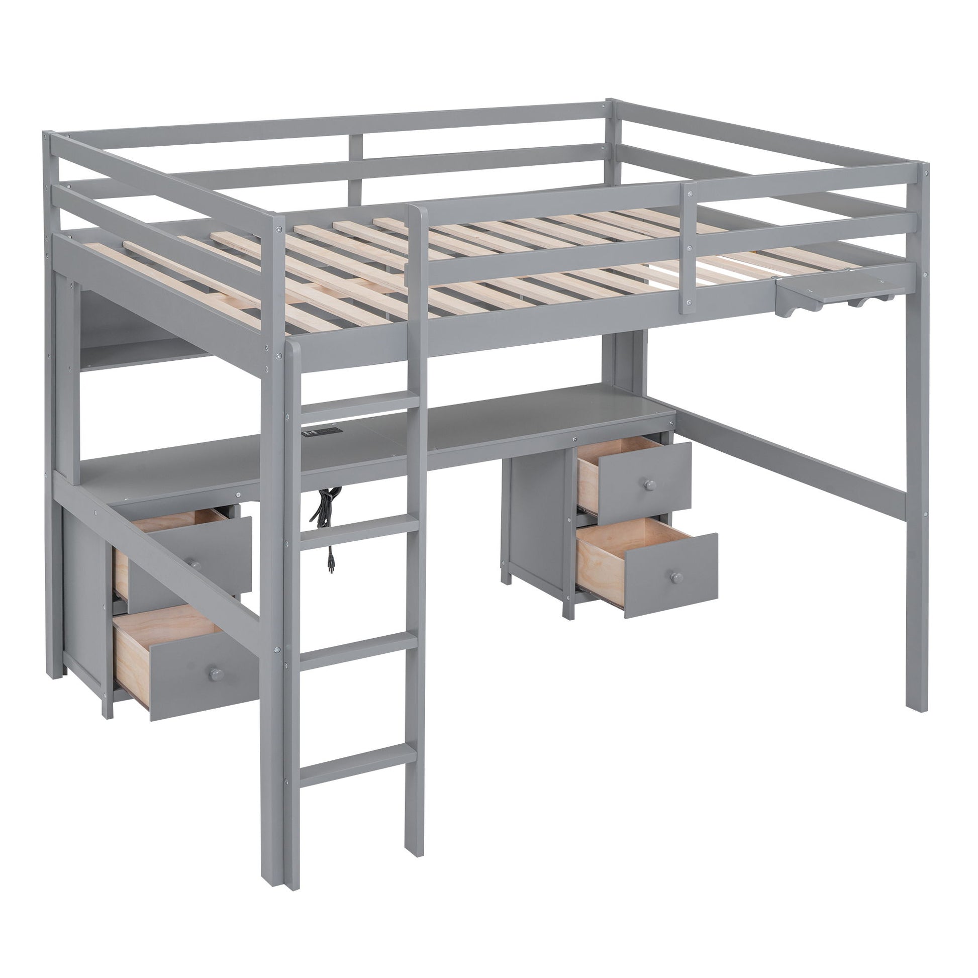 Full Size Loft Bed With Built In Desk, Storage Cabinets, Drawers, Charging Station, And Bedside Tray - Gray
