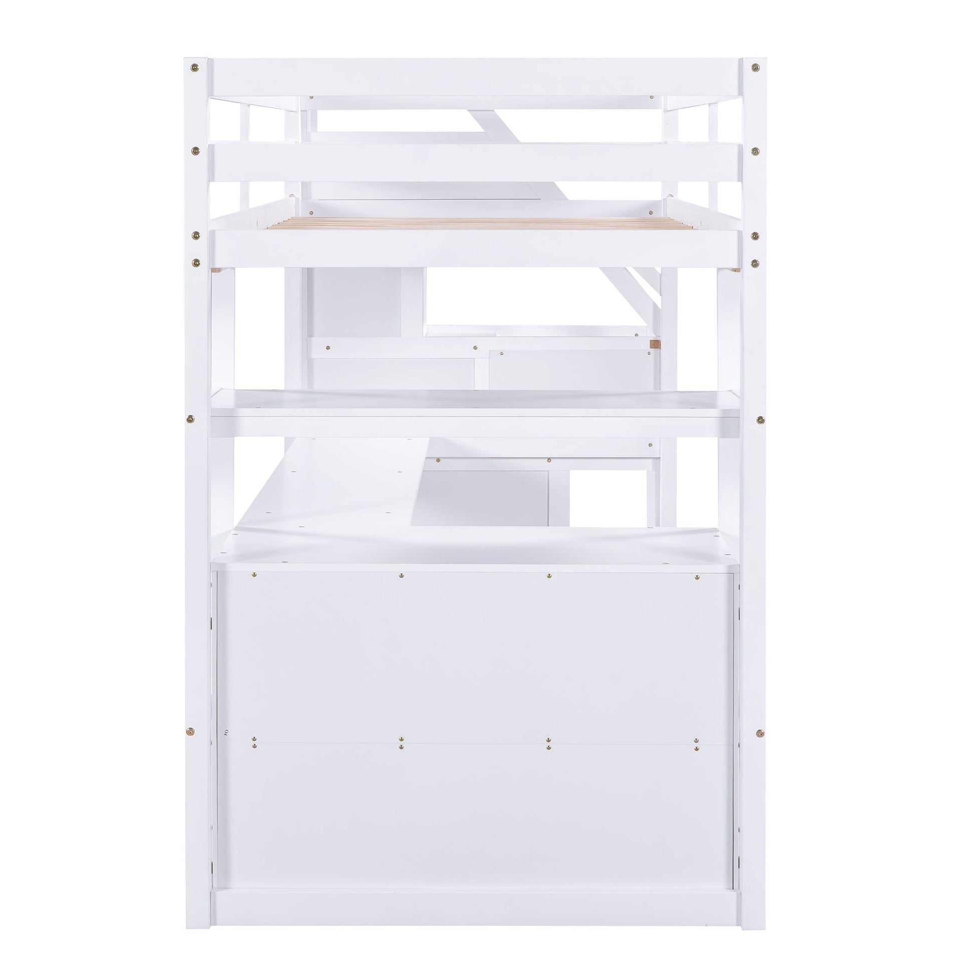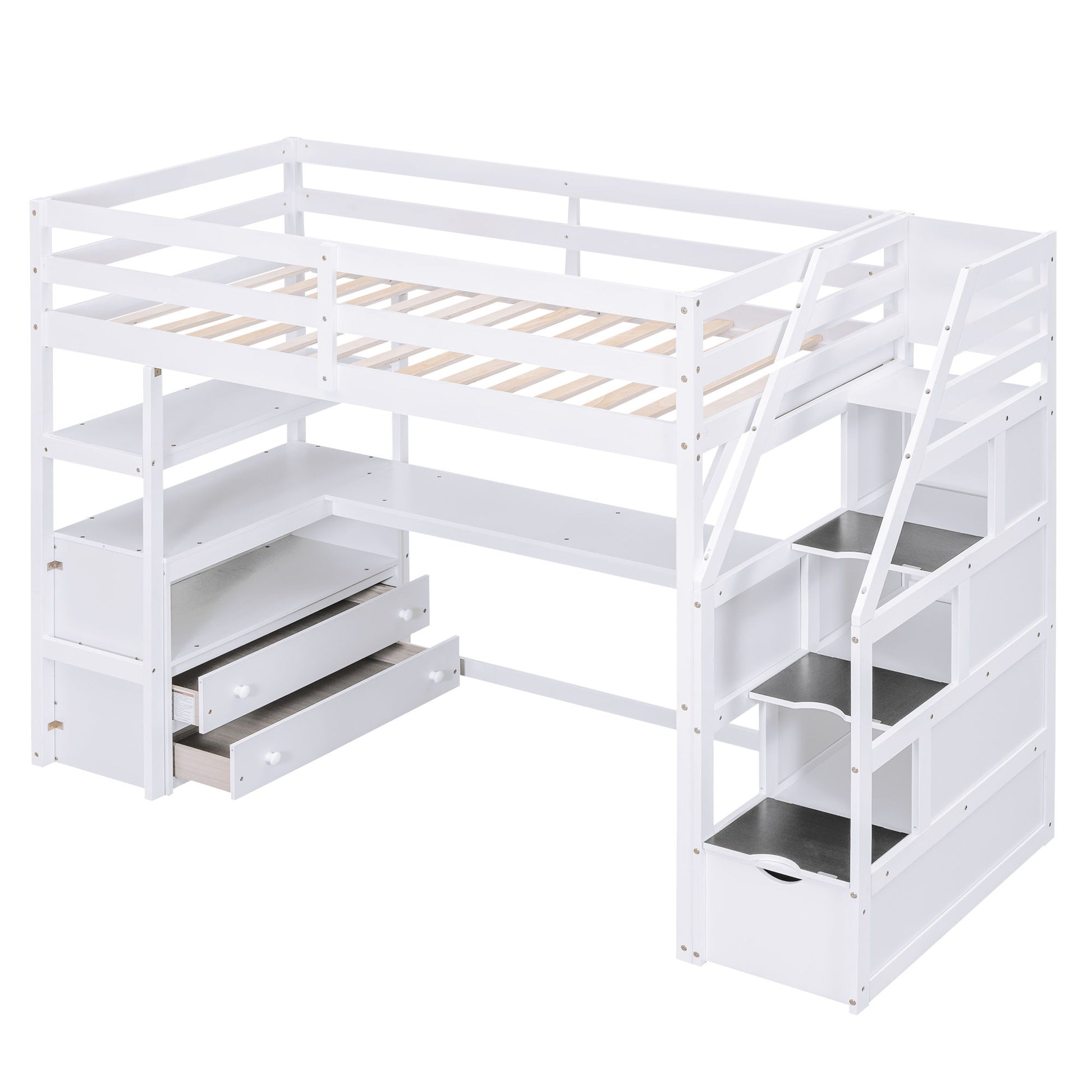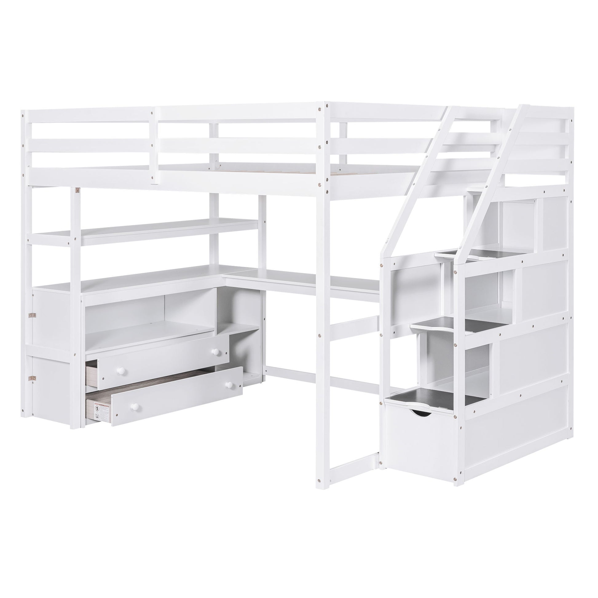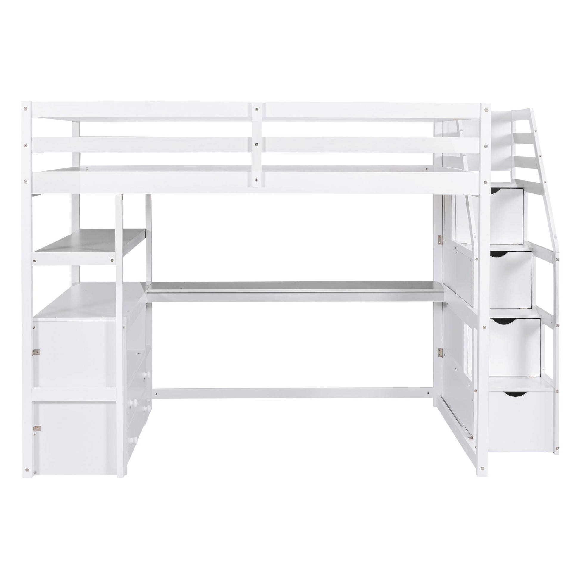 Full Size Loft Bed With Desk, Shelves, 2 Drawers, Storage Staircase - White