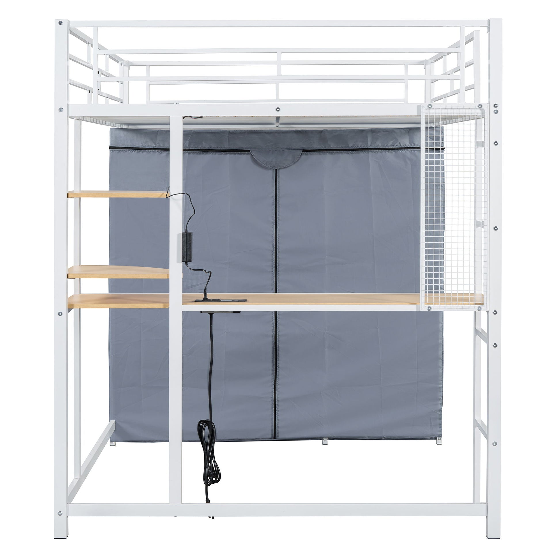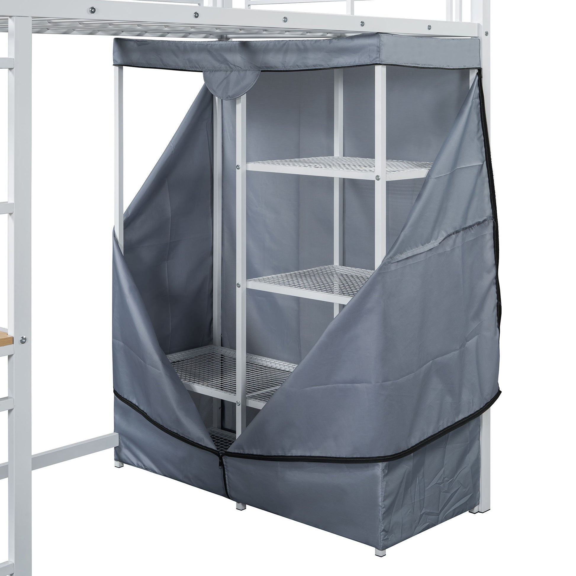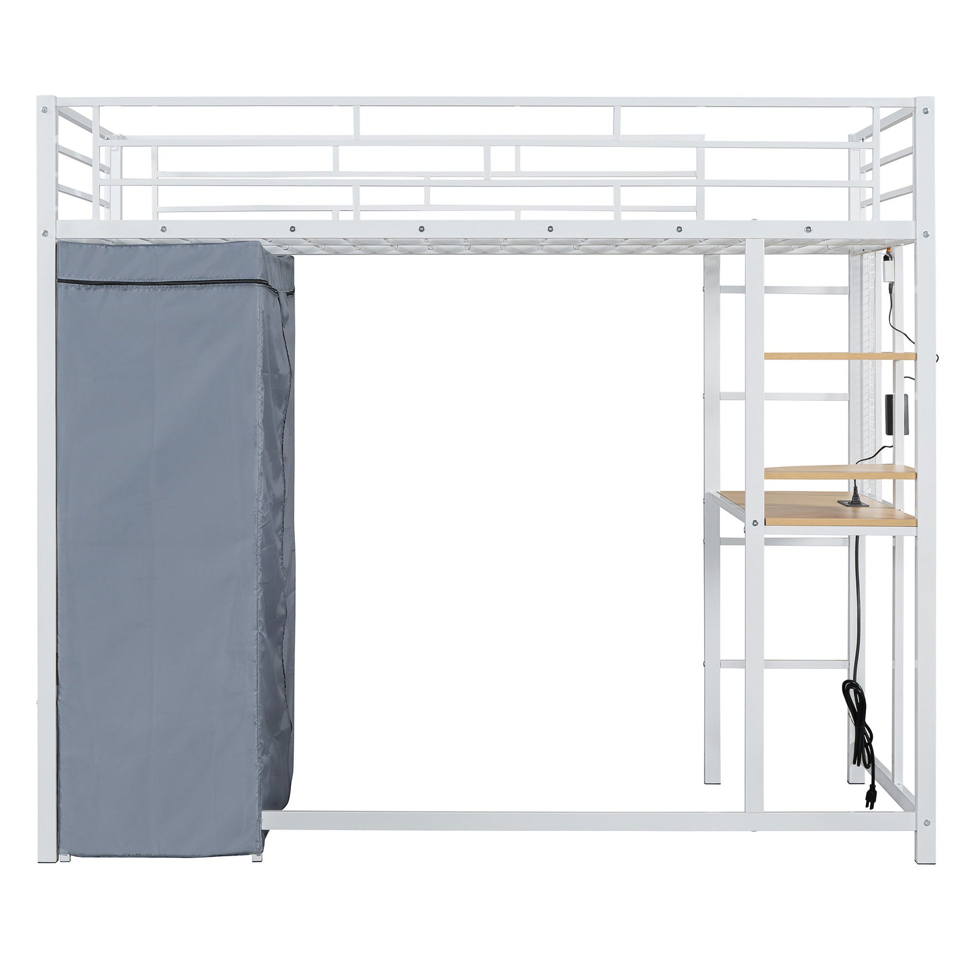 Loft Bed With Desk, Shelves, Power Outlet, LED Light And Wardrobe