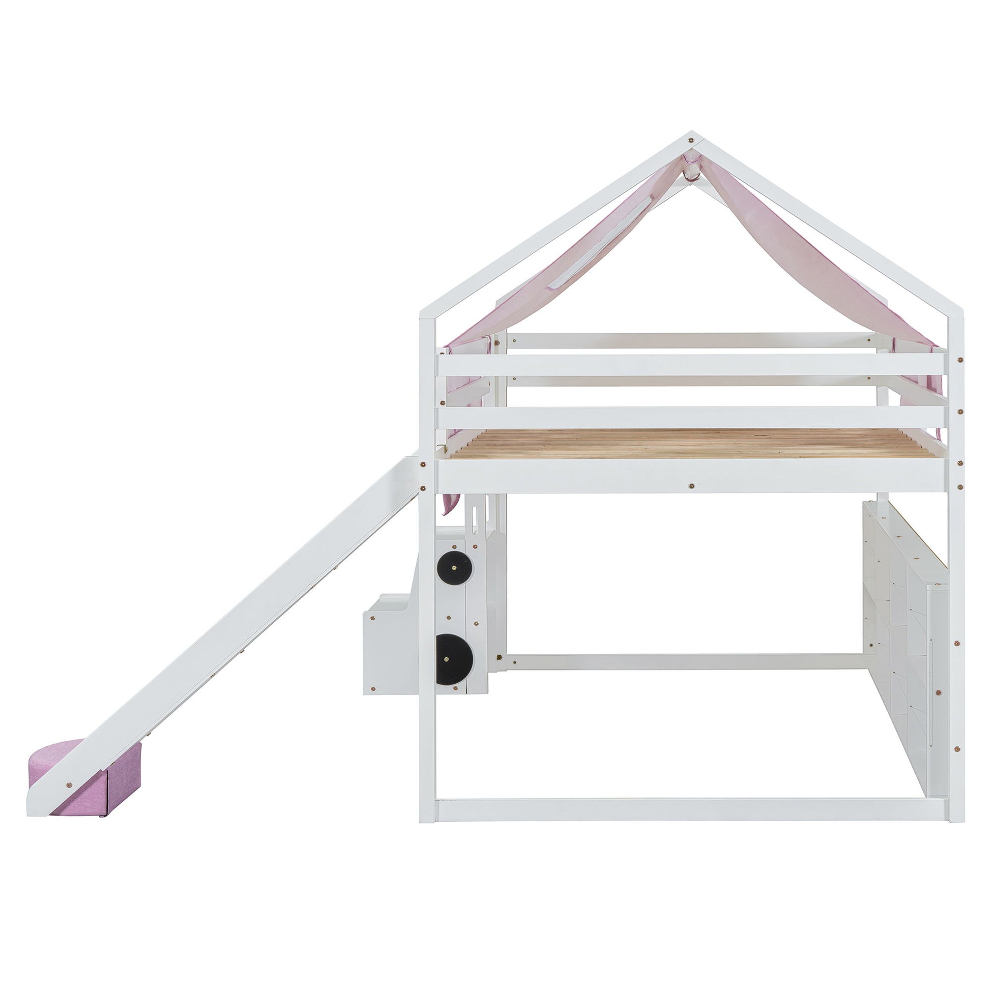 Twin Size Charming House Shaped Loft Bed With Tent And Slide - White / Pink