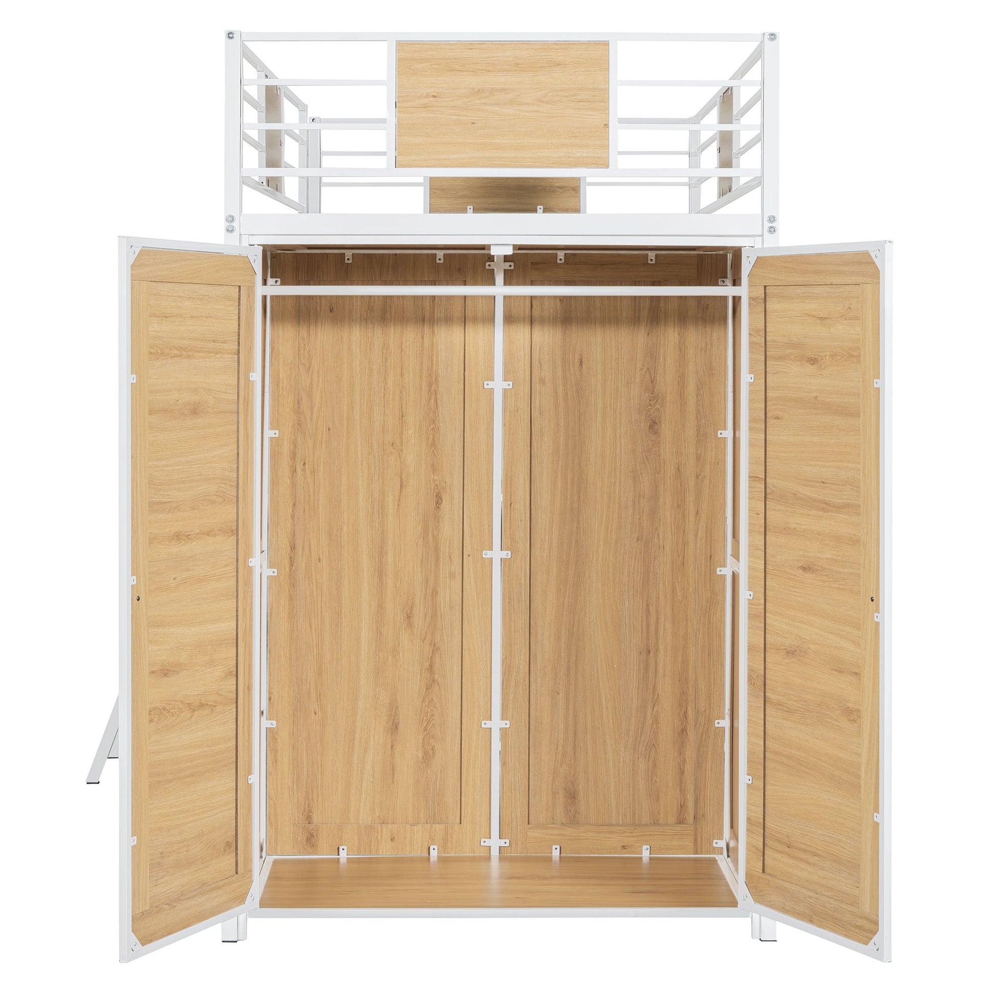 Elegant Design: The loft bed features a modern style with a sophisticated blend of iron and wood in its guardrail construction, making it a versatile addition to any decor.