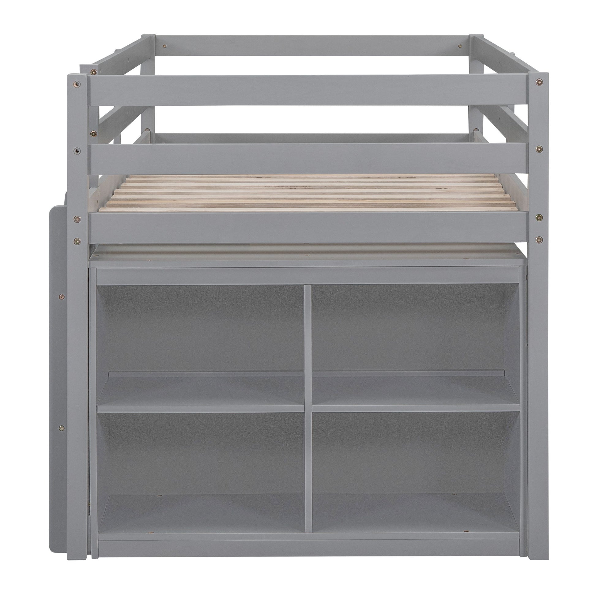 Full Size Loft Bed With Retractable Writing Desk And 4 Drawers, With Lateral Portable Desk And Shelves - Gray