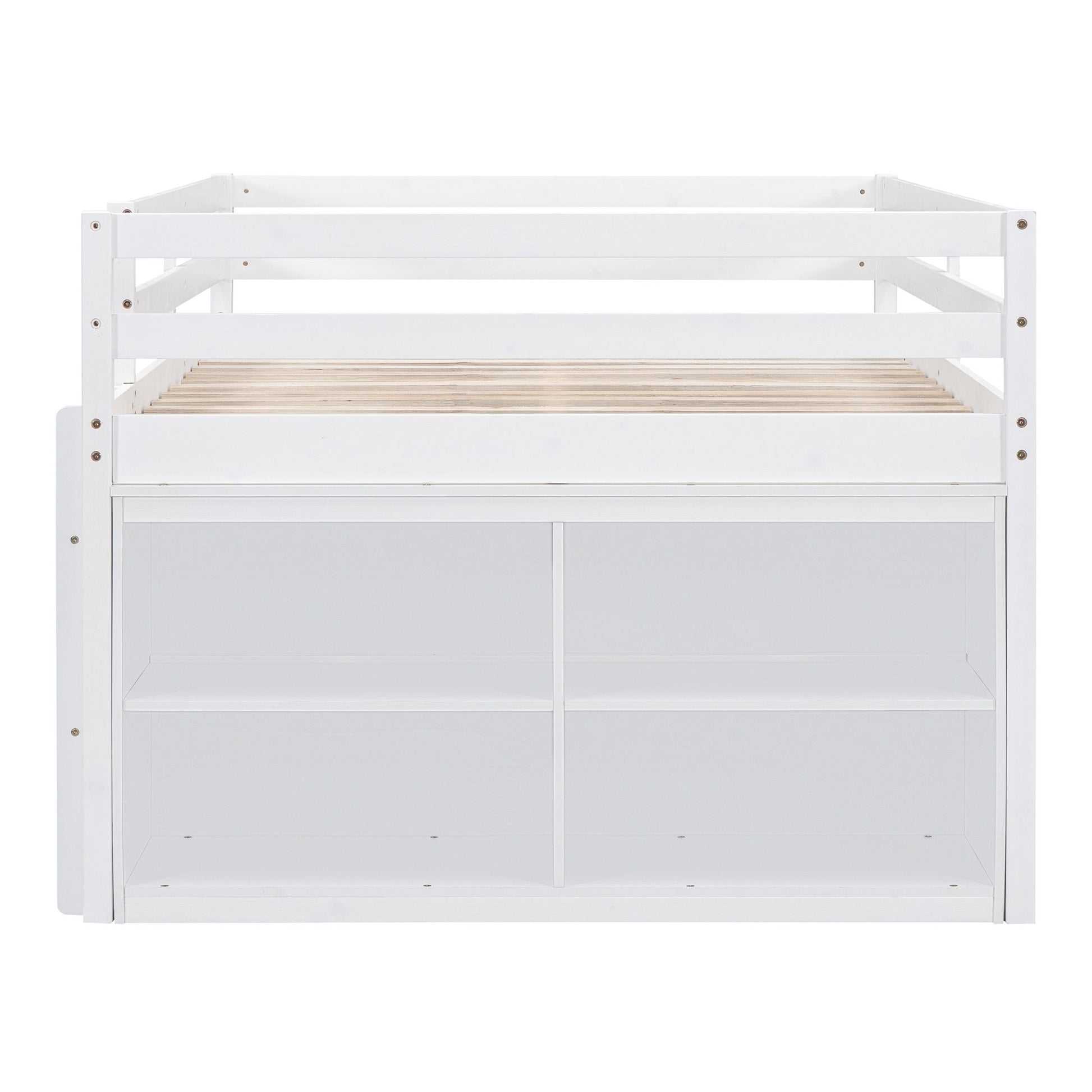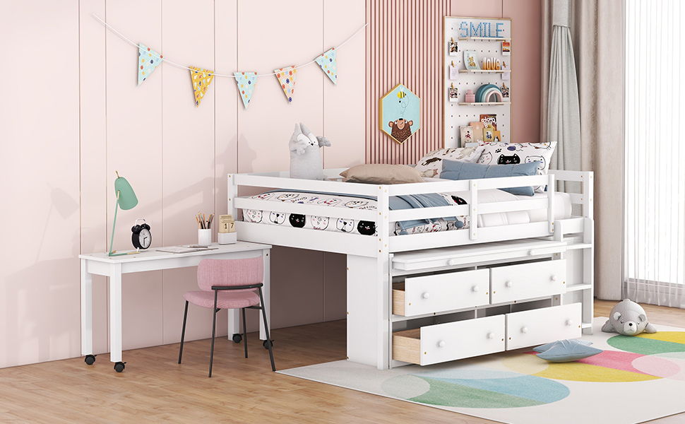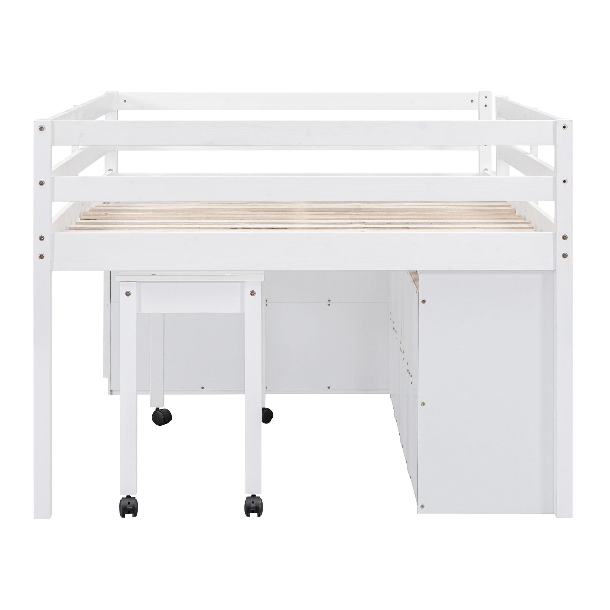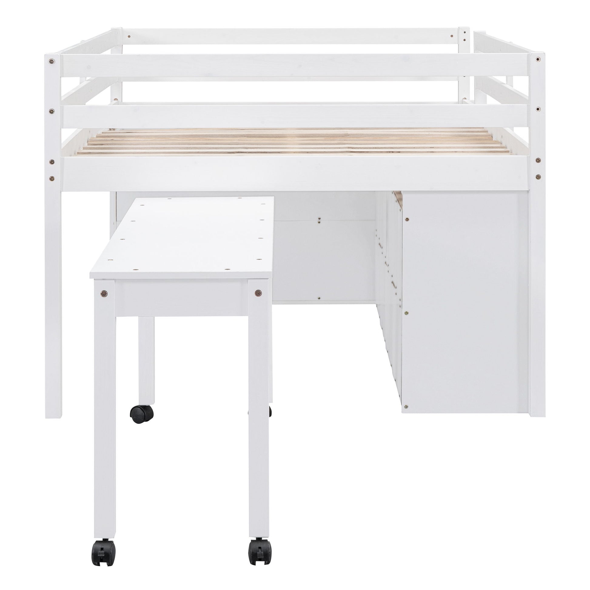 Full Size Loft Bed With Retractable Writing Desk And 4 Drawers, With Lateral Portable Desk And Shelves - White