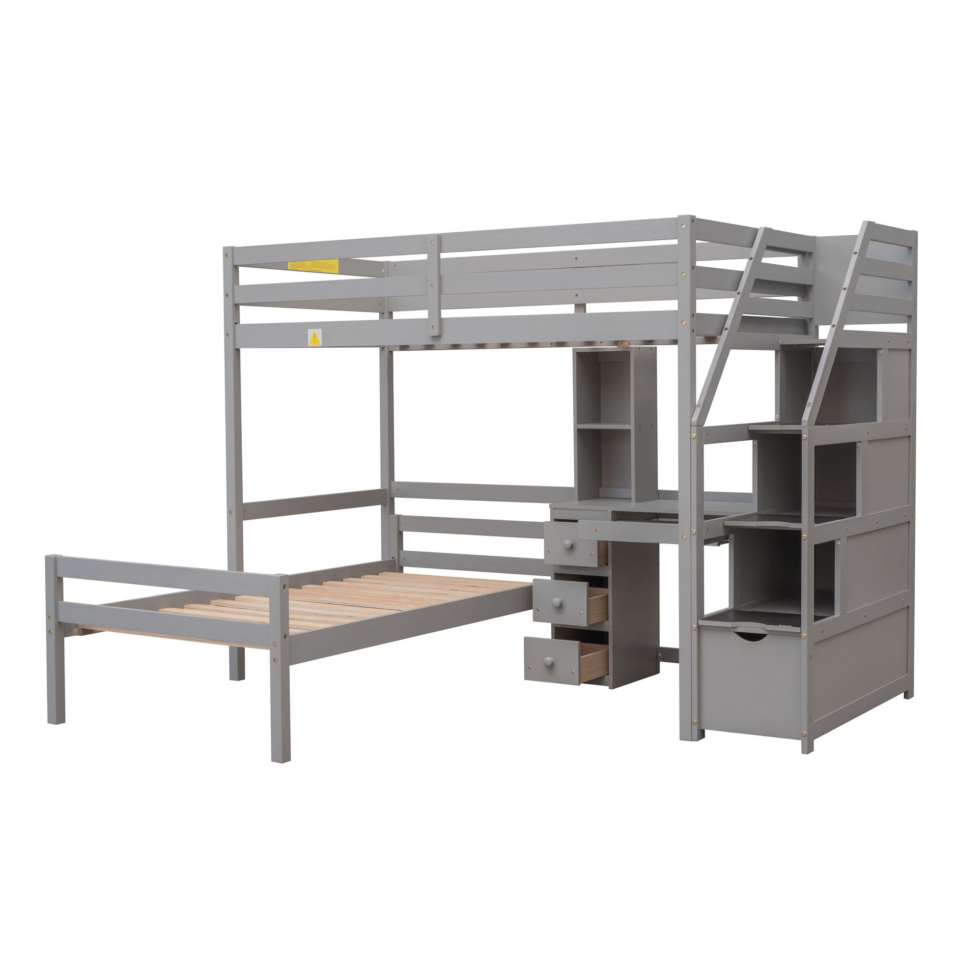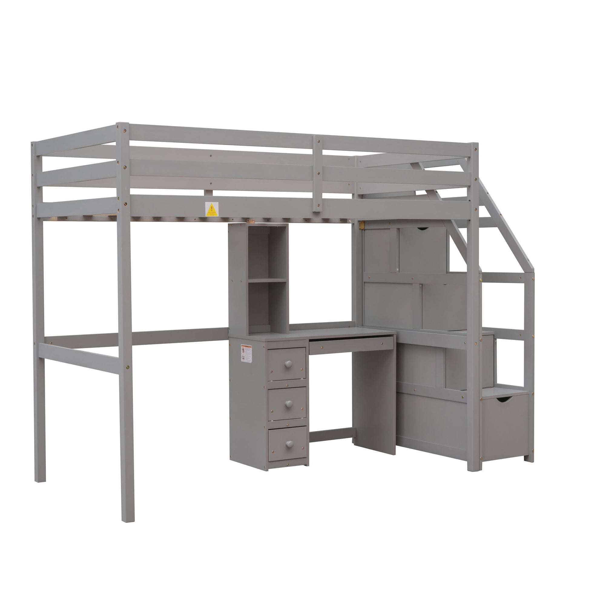 Twin Size Loft Bed With Stand Alone Bunk, Storage Staircase, Desk, Shelves, And Drawers - Gray