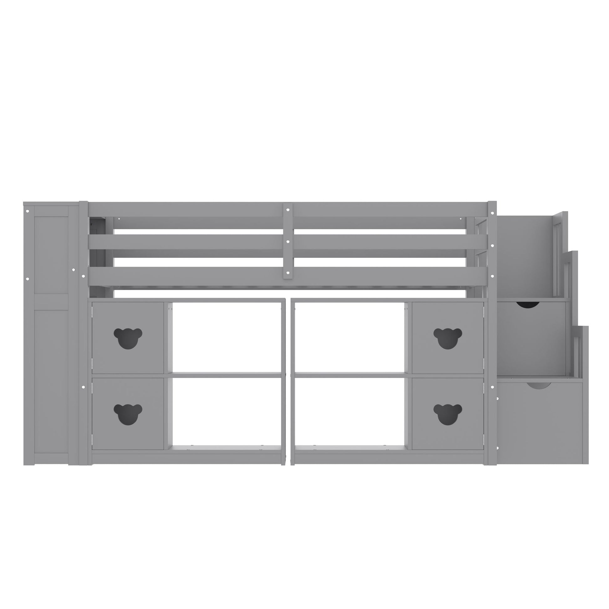 Twin Loft Bed With Storage Cabinets, Staircase Drawers & LED Lights - Gray Solid