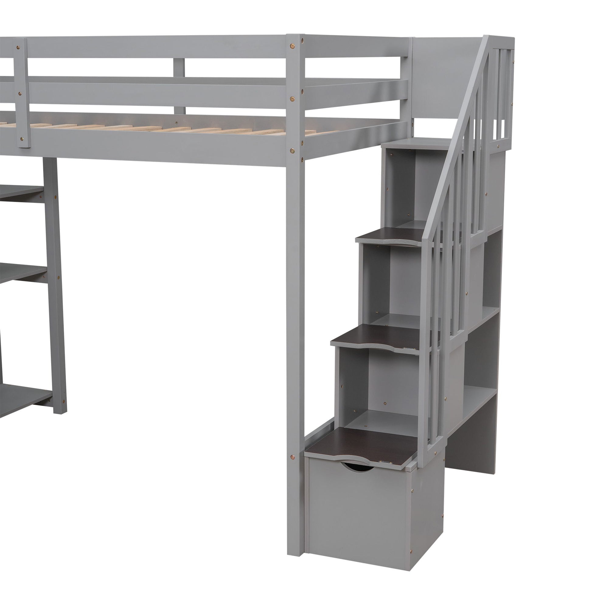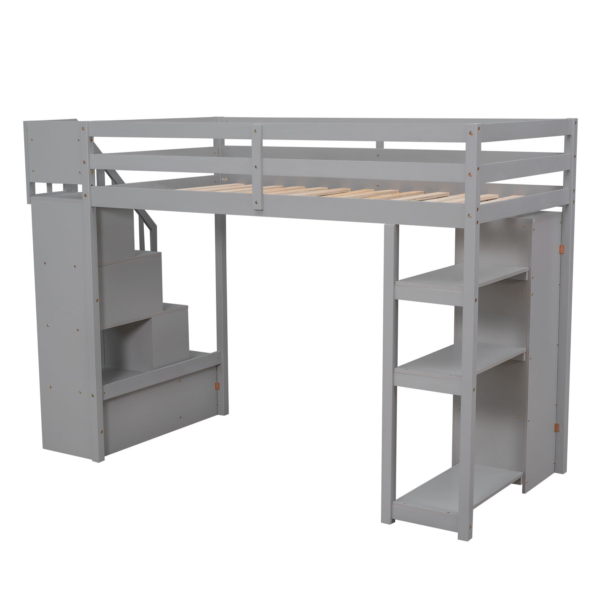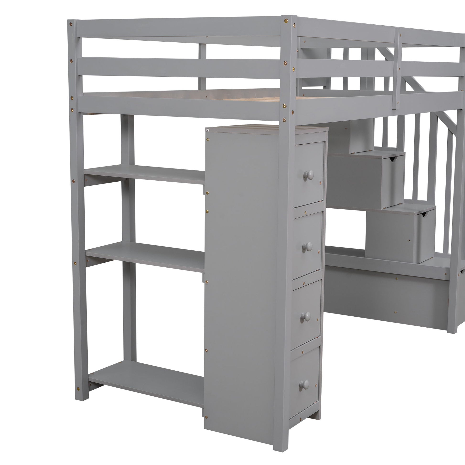 Twin Size Loft Bed With Storage Drawers And Stairs With Shelves - Gray