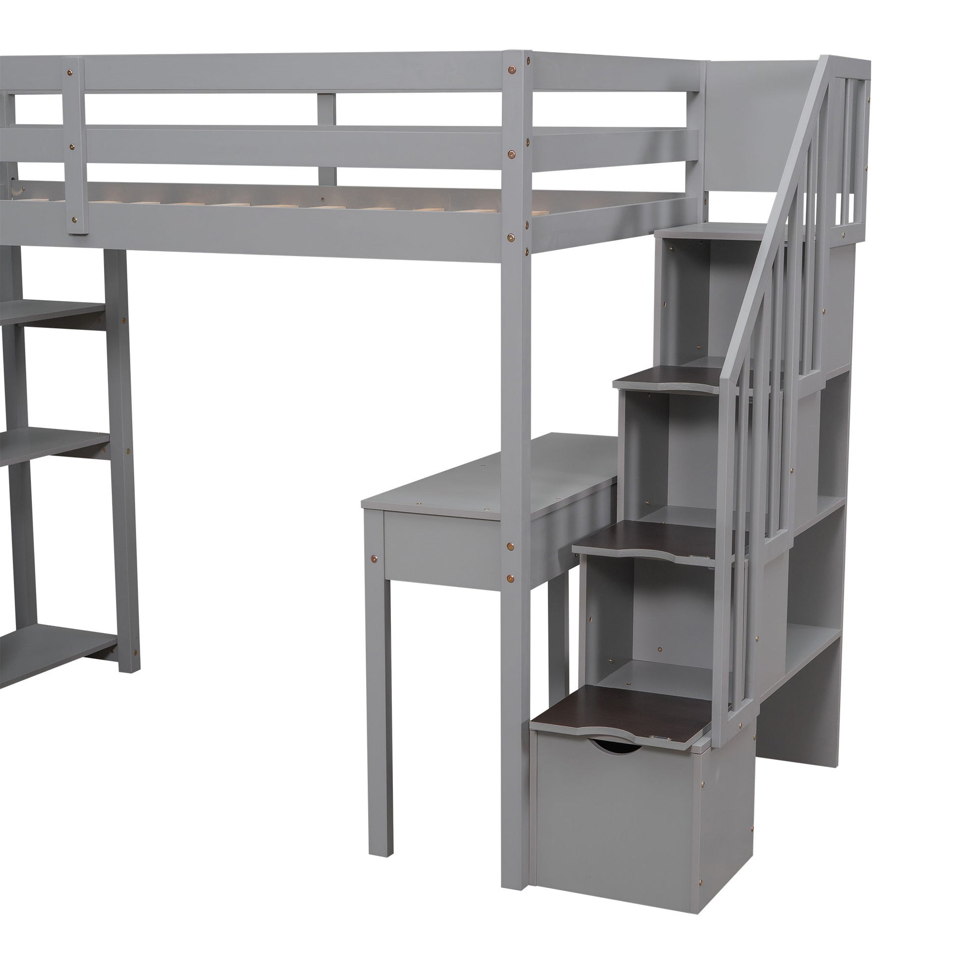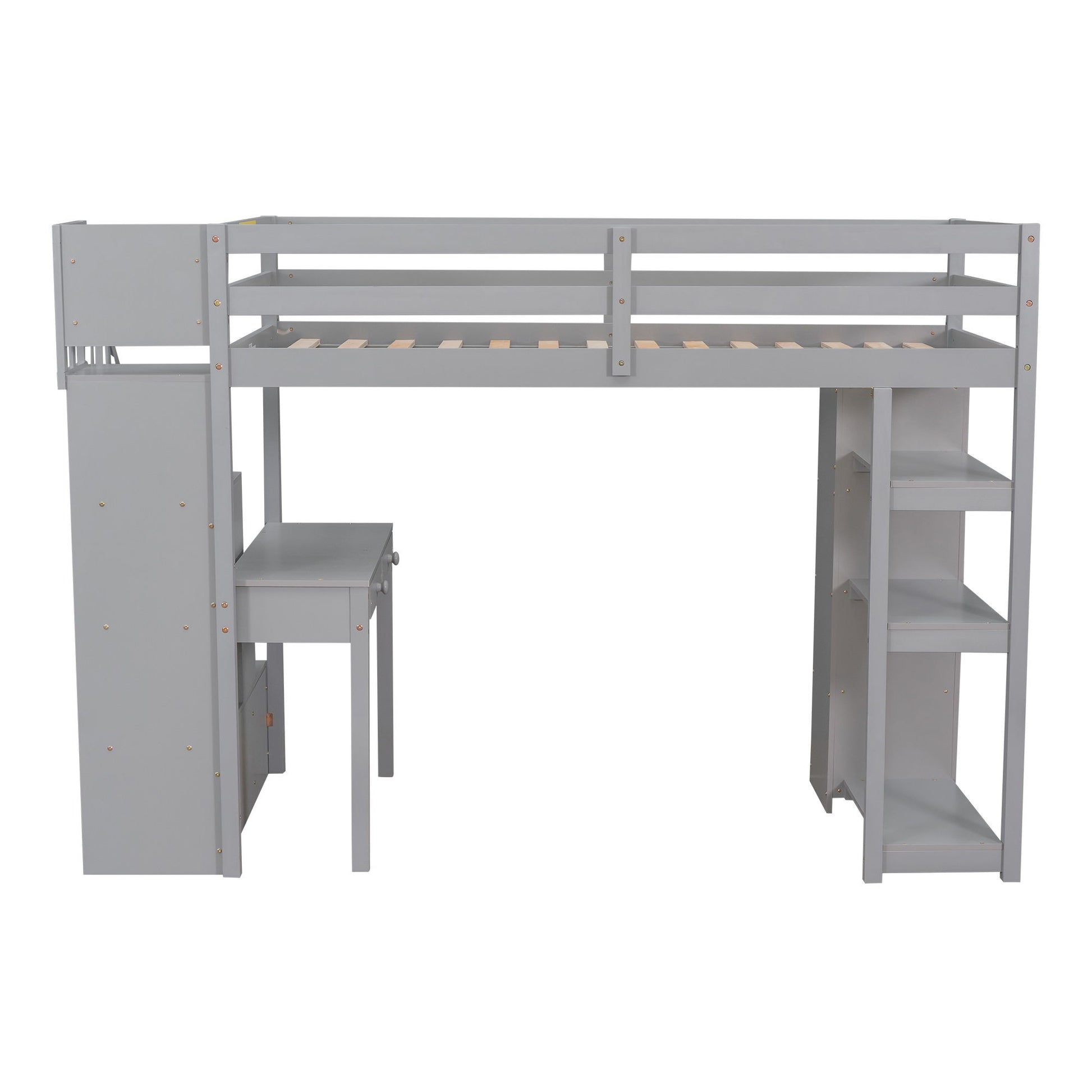 Twin Size Loft Bed With Storage Drawers, Desk And Stairs With Shelves - Gray