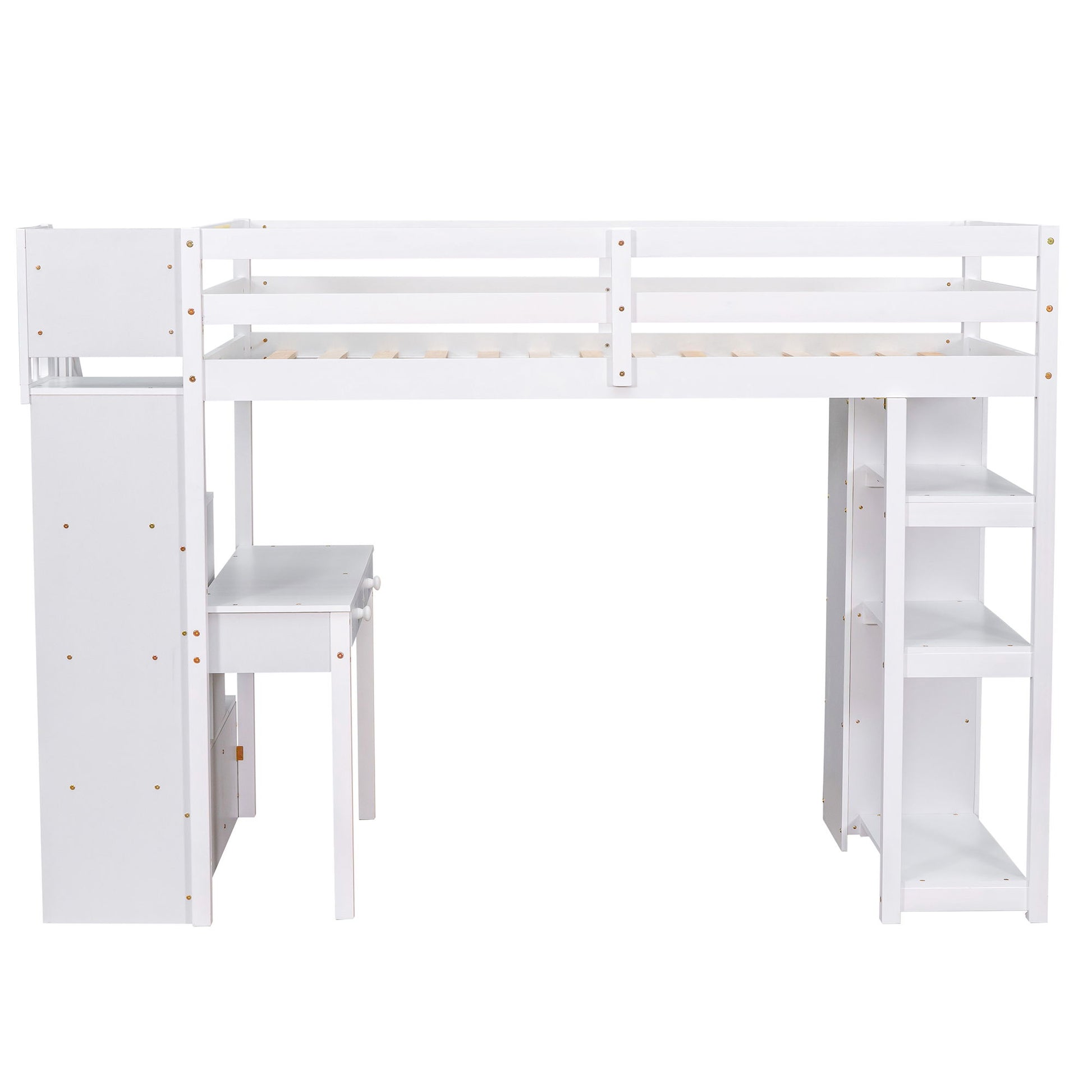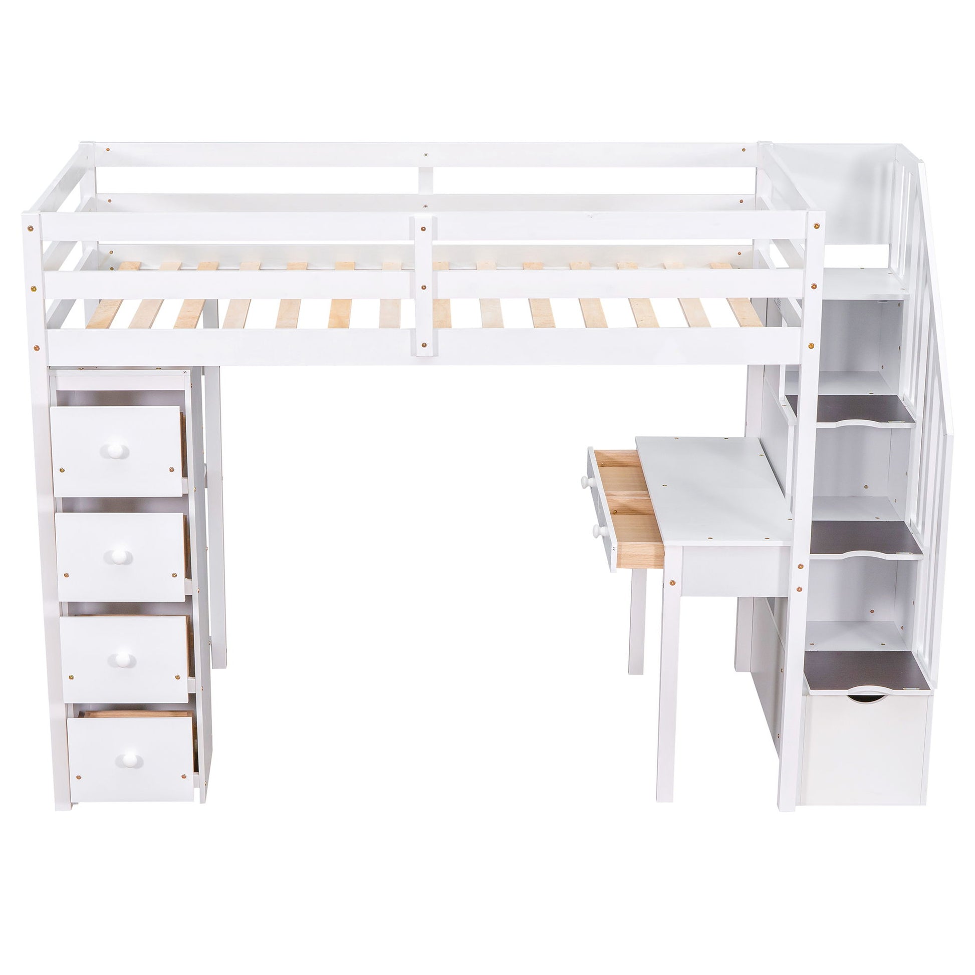 Twin Size Loft Bed With Storage Drawers, Desk And Stairs With Shelves - White