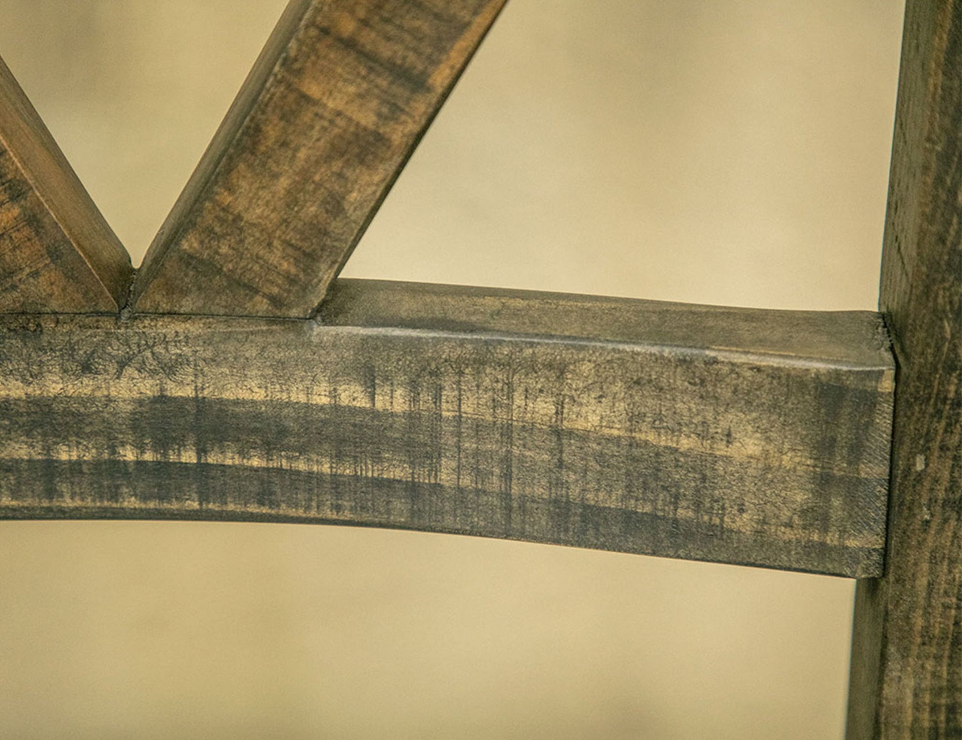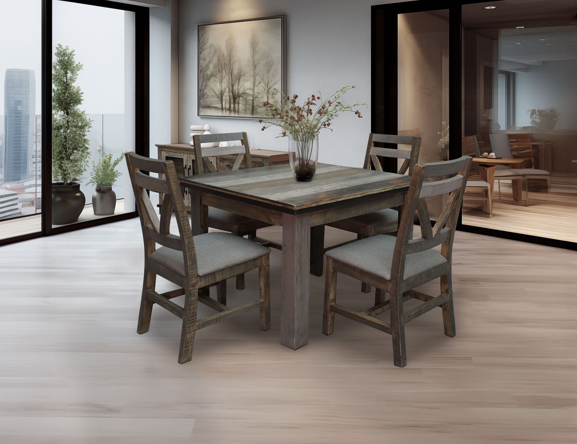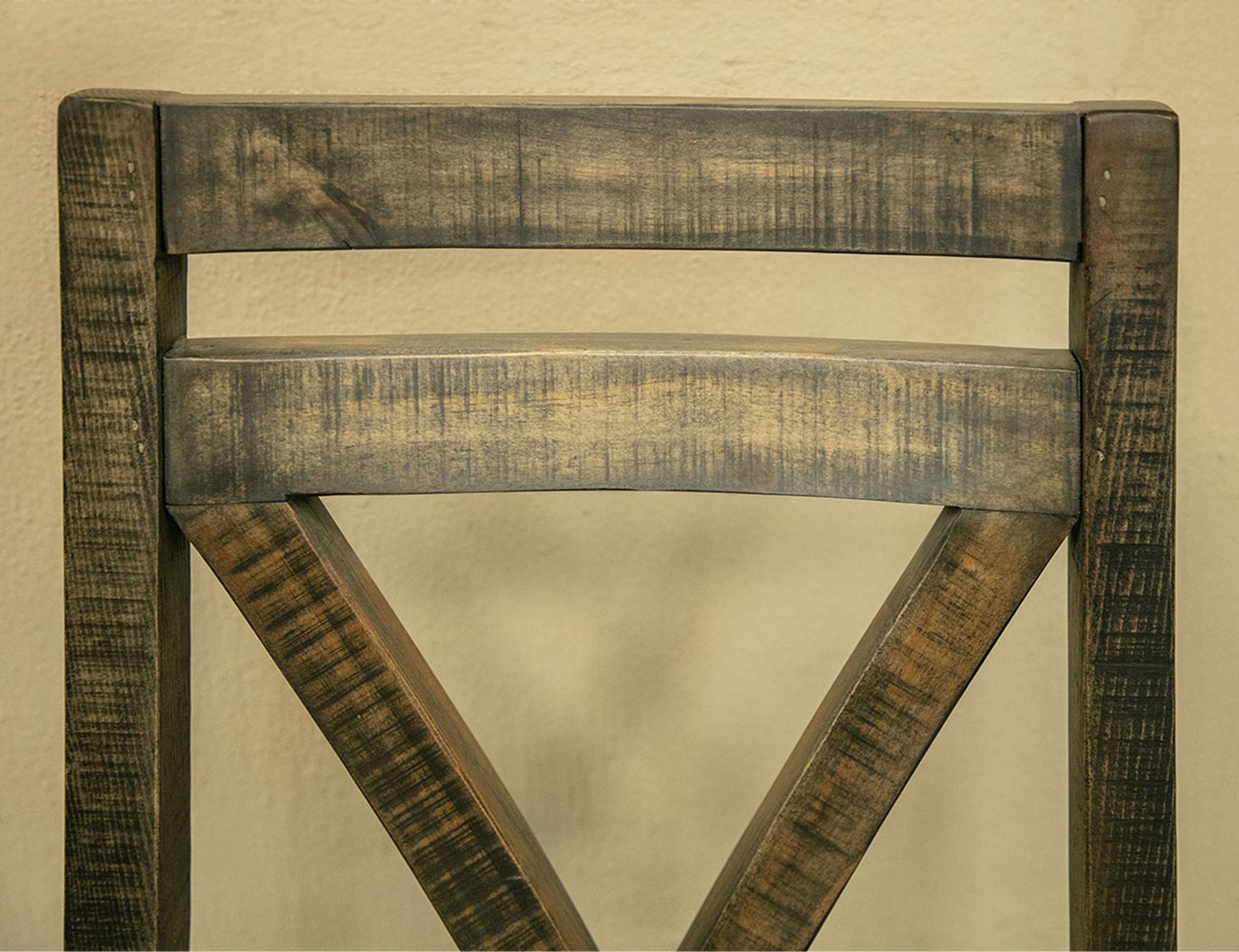 - Multi-step, hand-painted finish in gray and brown tones for a "reclaimed wood" look.
