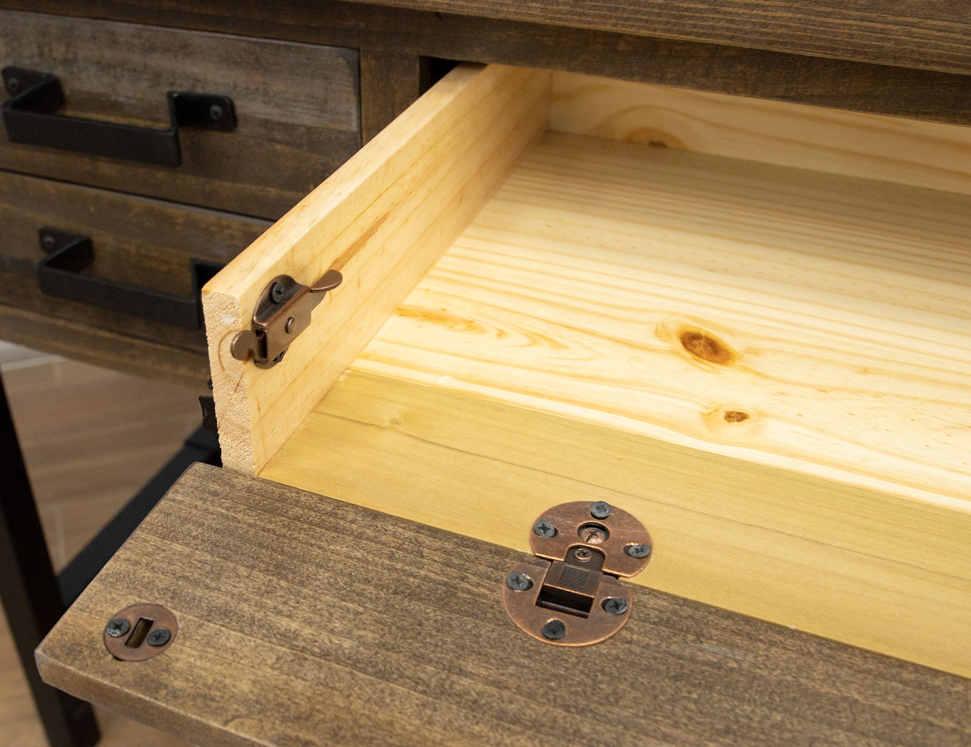 - Multi-step hand-painted water-based acrylic lacquer finish in gray and brown tones for an updated “reclaimed wood” look.
