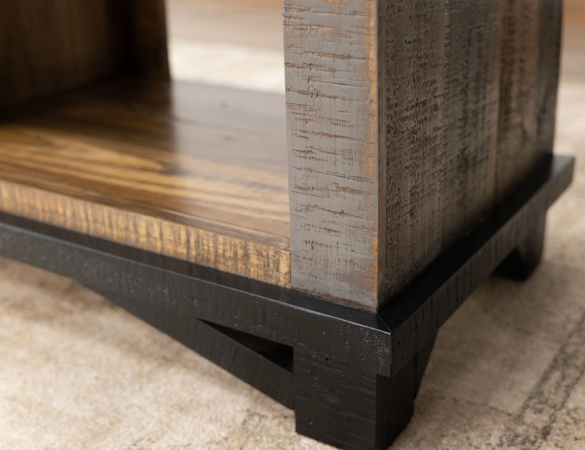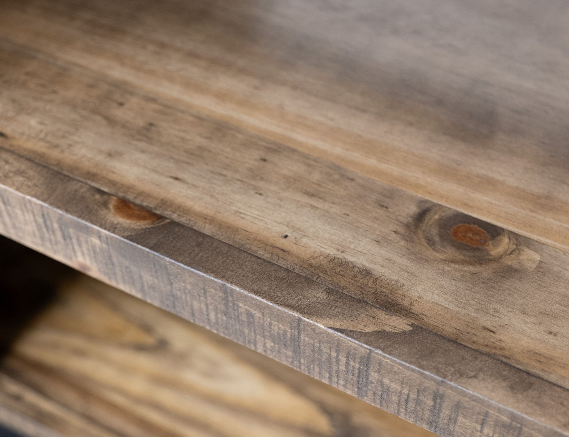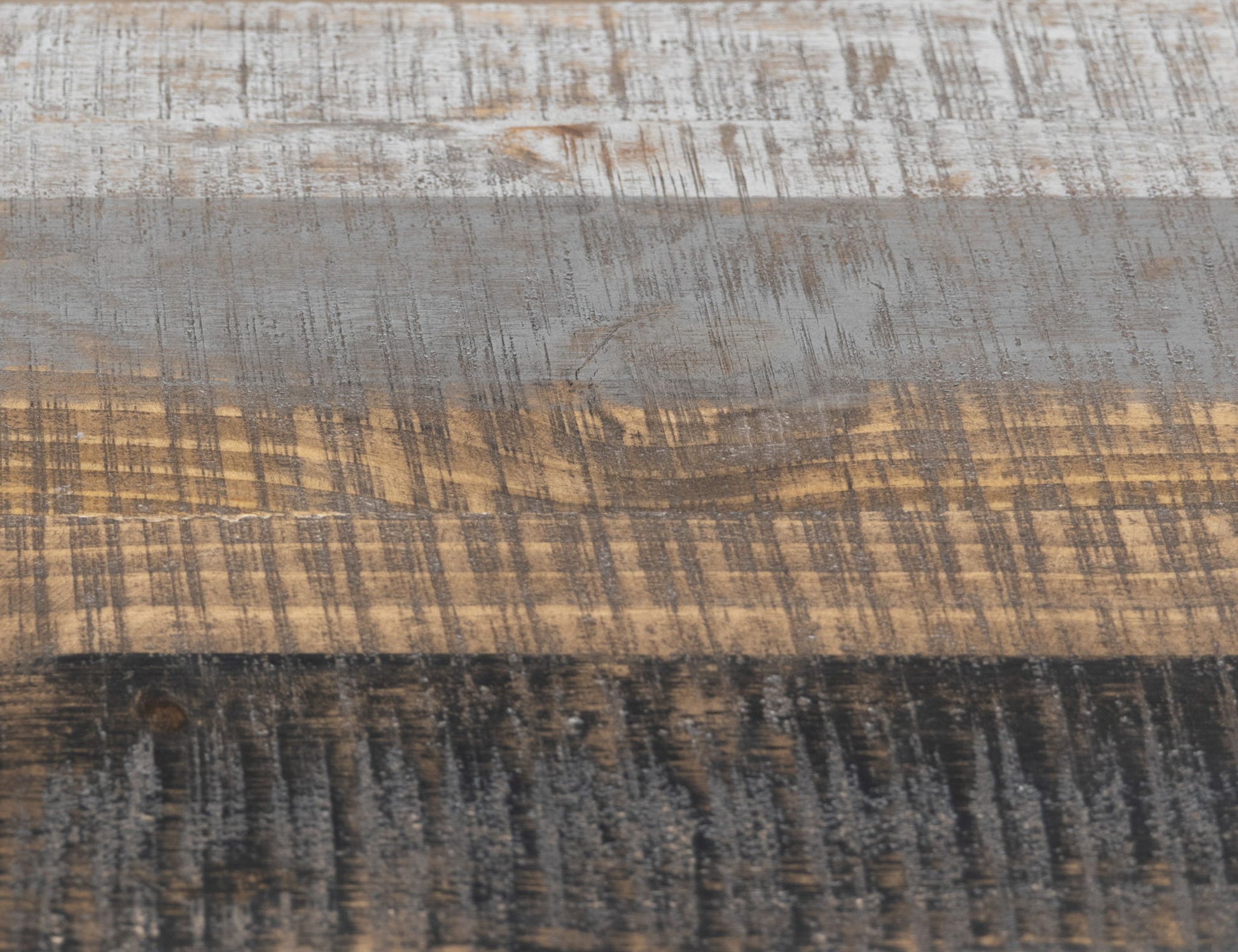 - Multi-step hand-painted water-based acrylic lacquer finish in gray and brown tones for an updated “reclaimed wood” look.