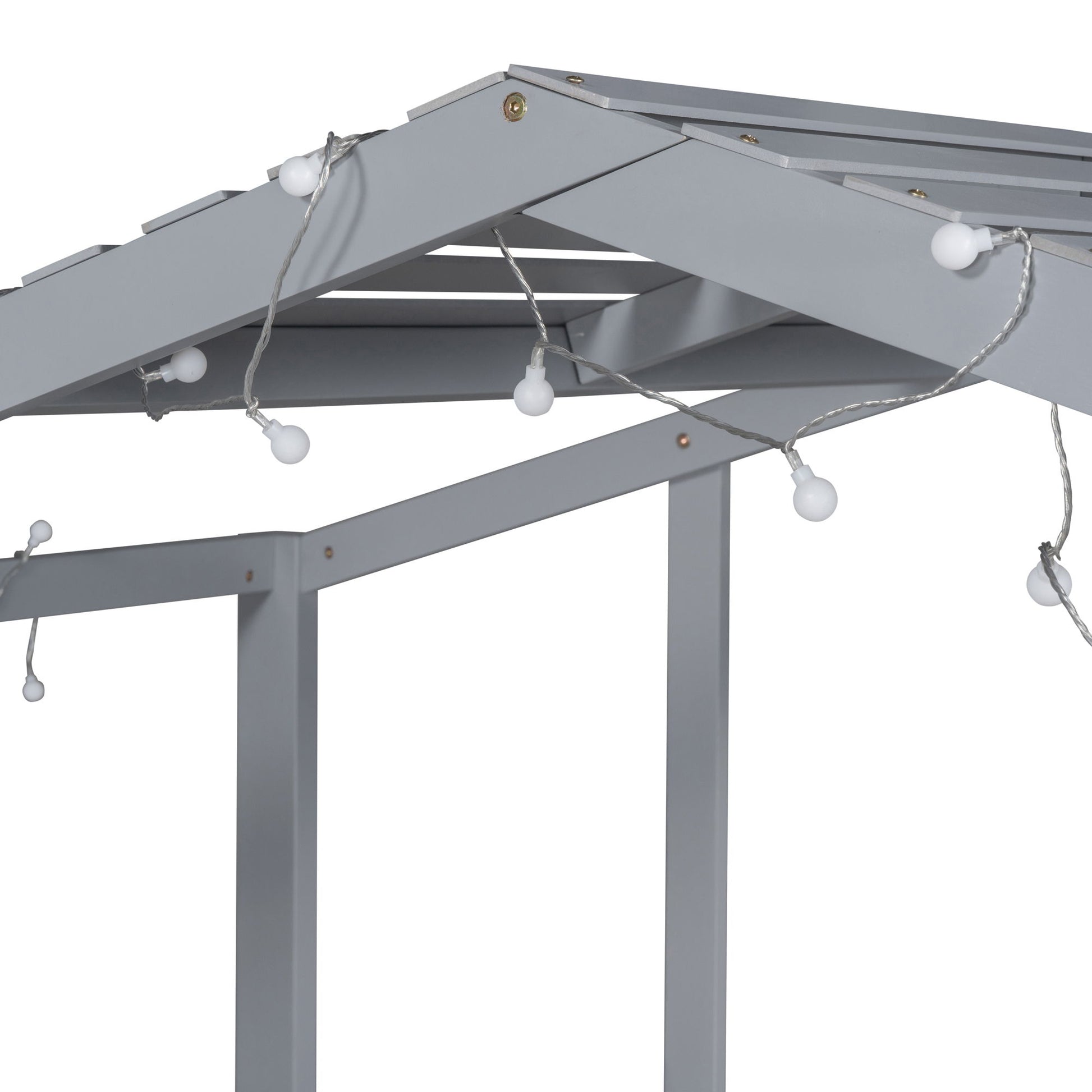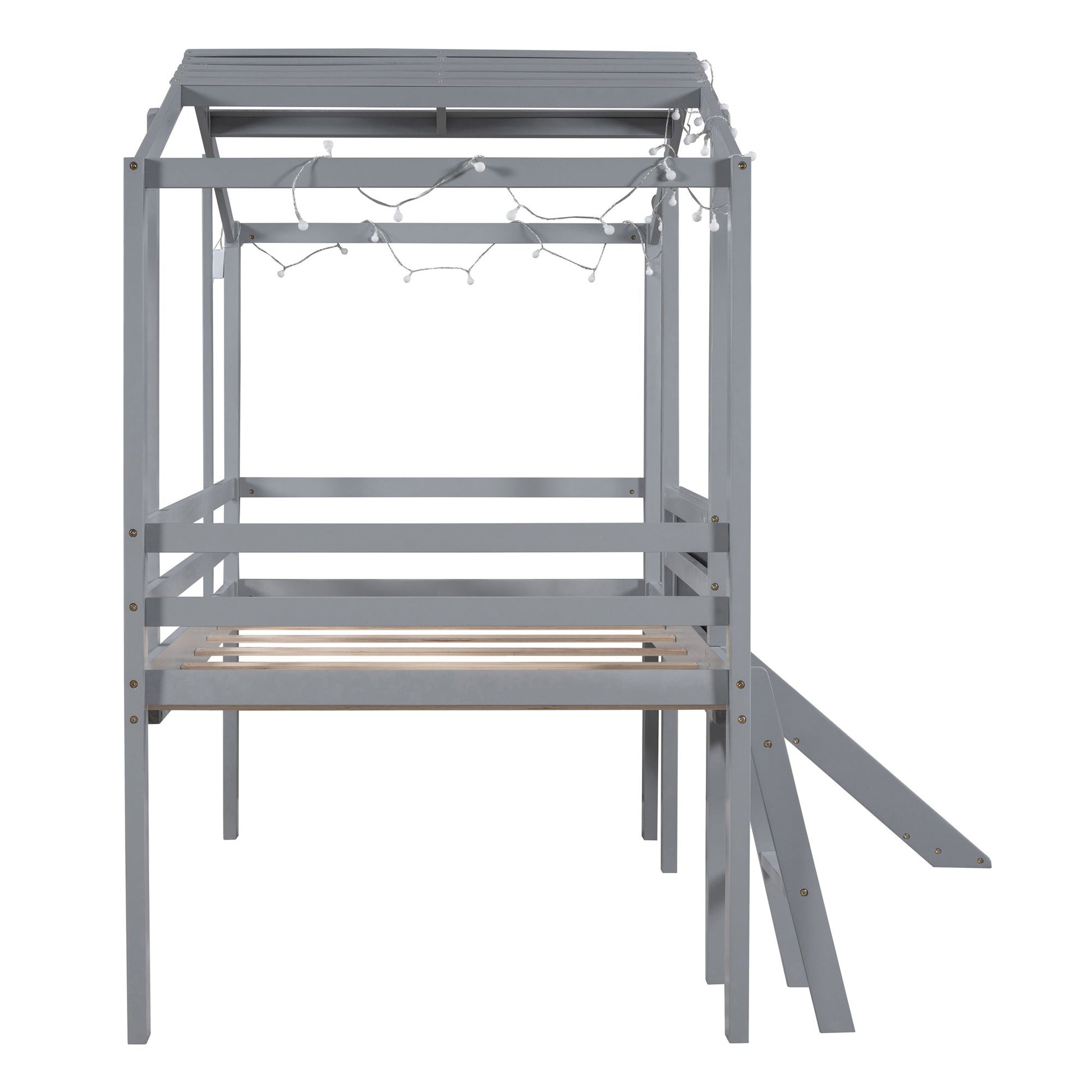 Twin Size Loft House Bed With Ladder And Slide, With Blackboard And Light Strip On The Roof - Gray