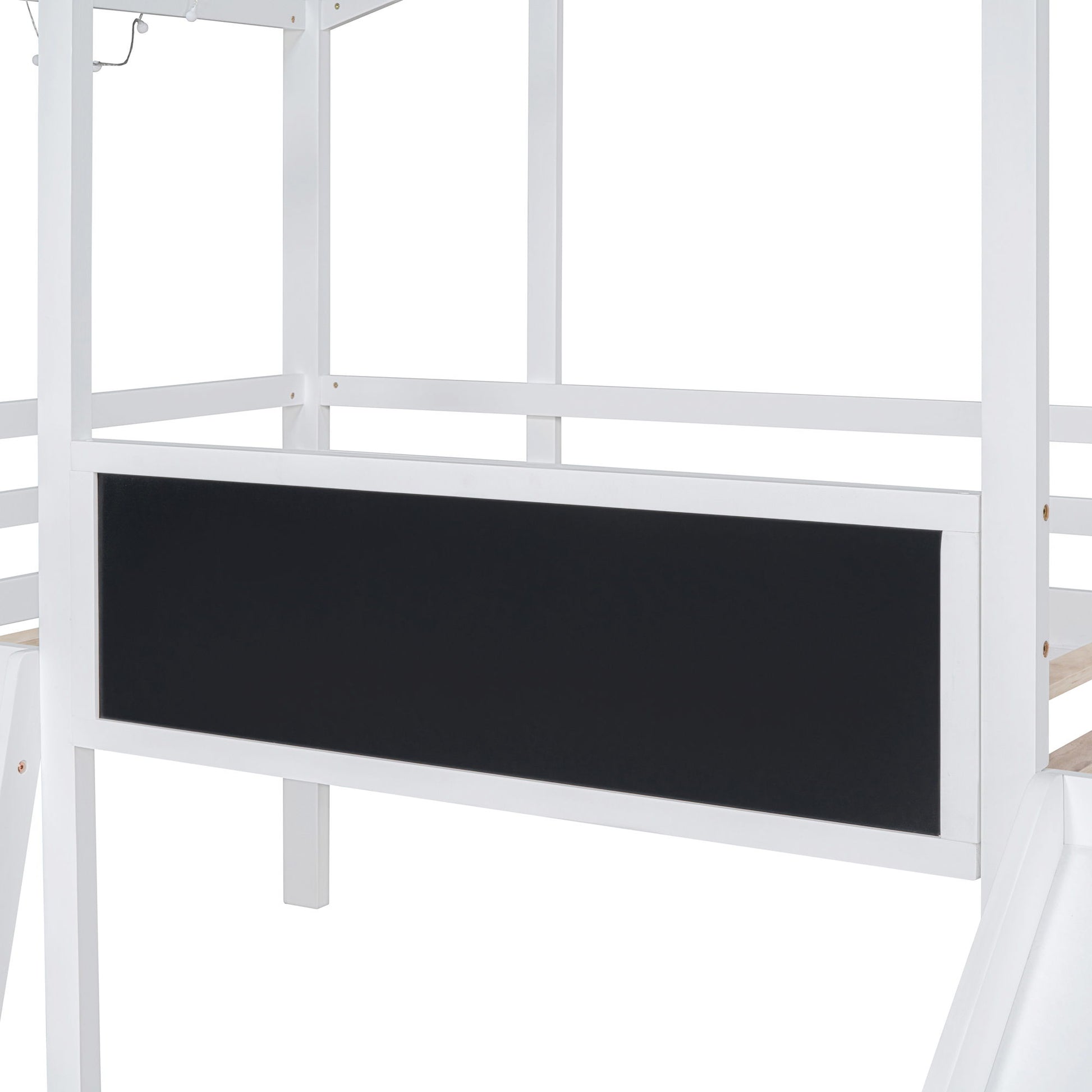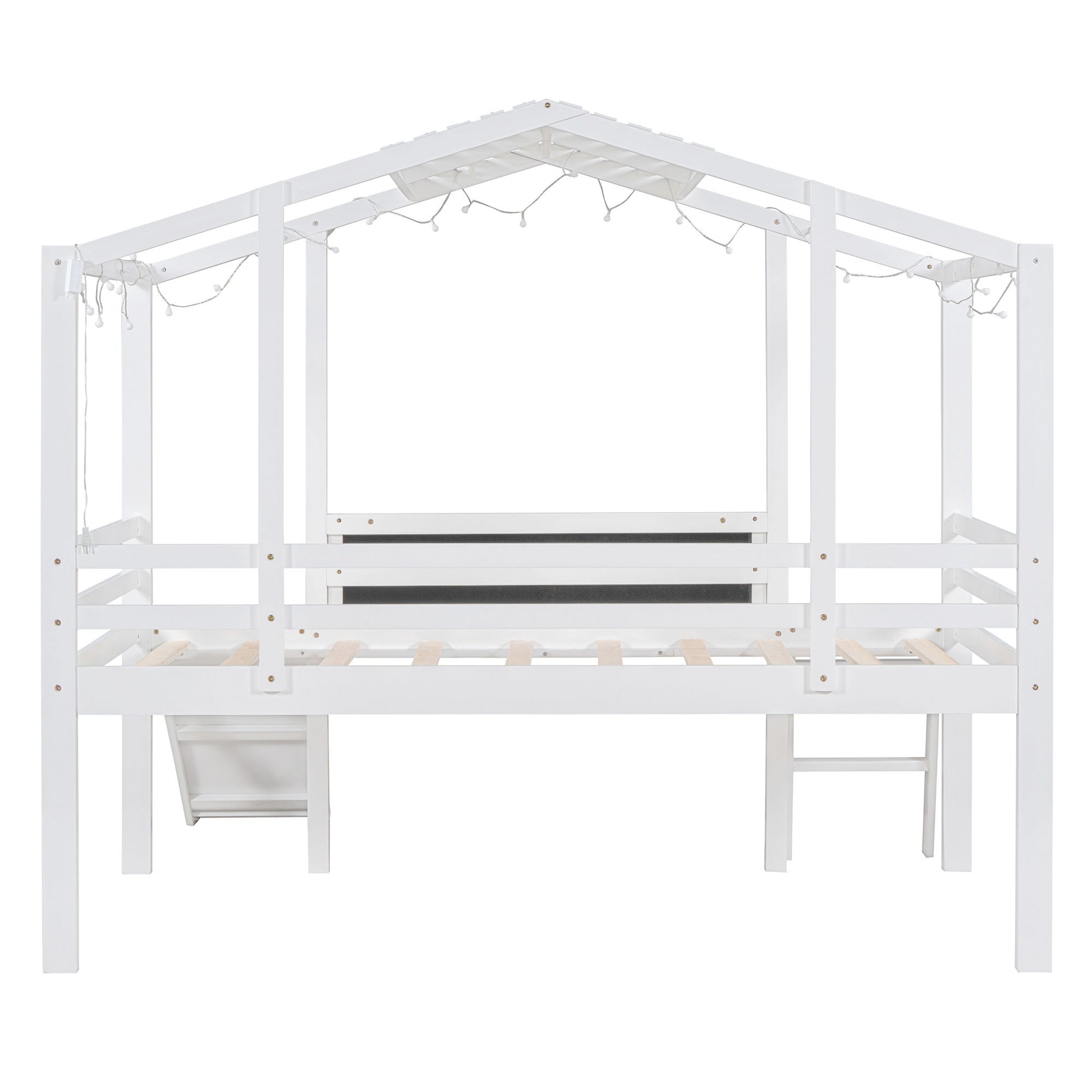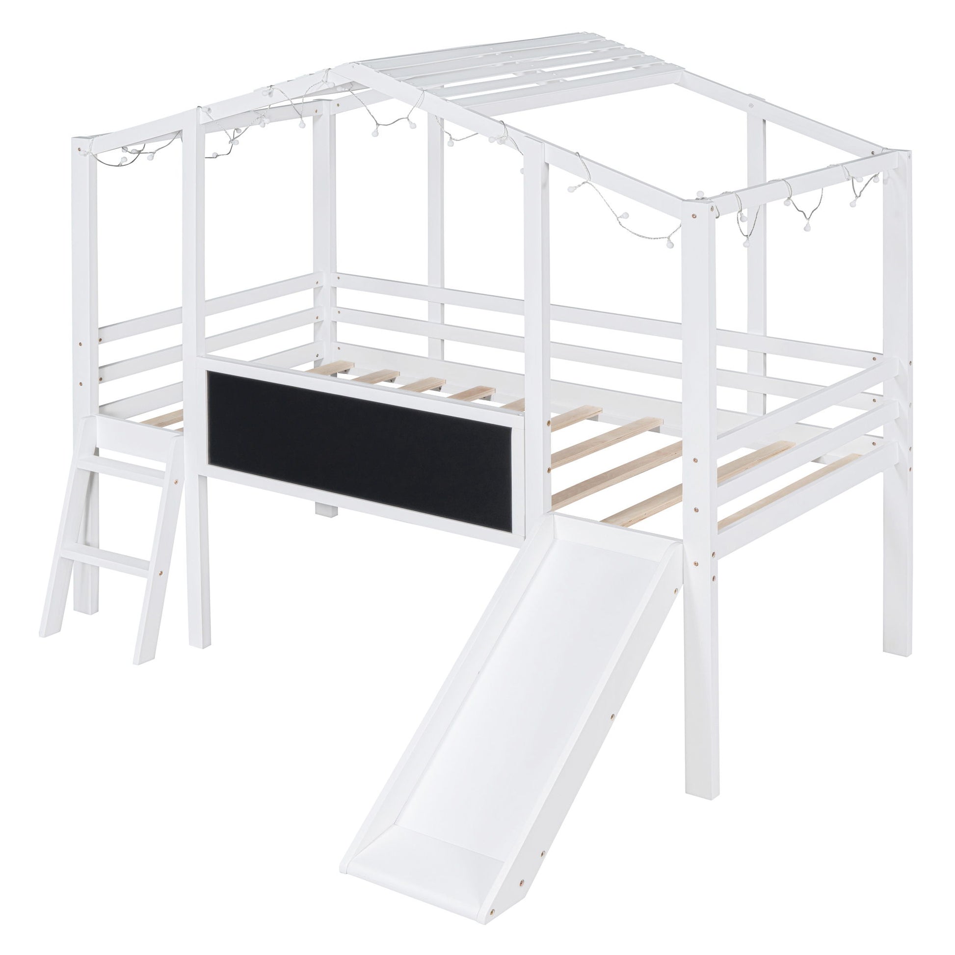 Twin Size Loft House Bed With Ladder And Slide, With Blackboard And Light Strip On The Roof - White