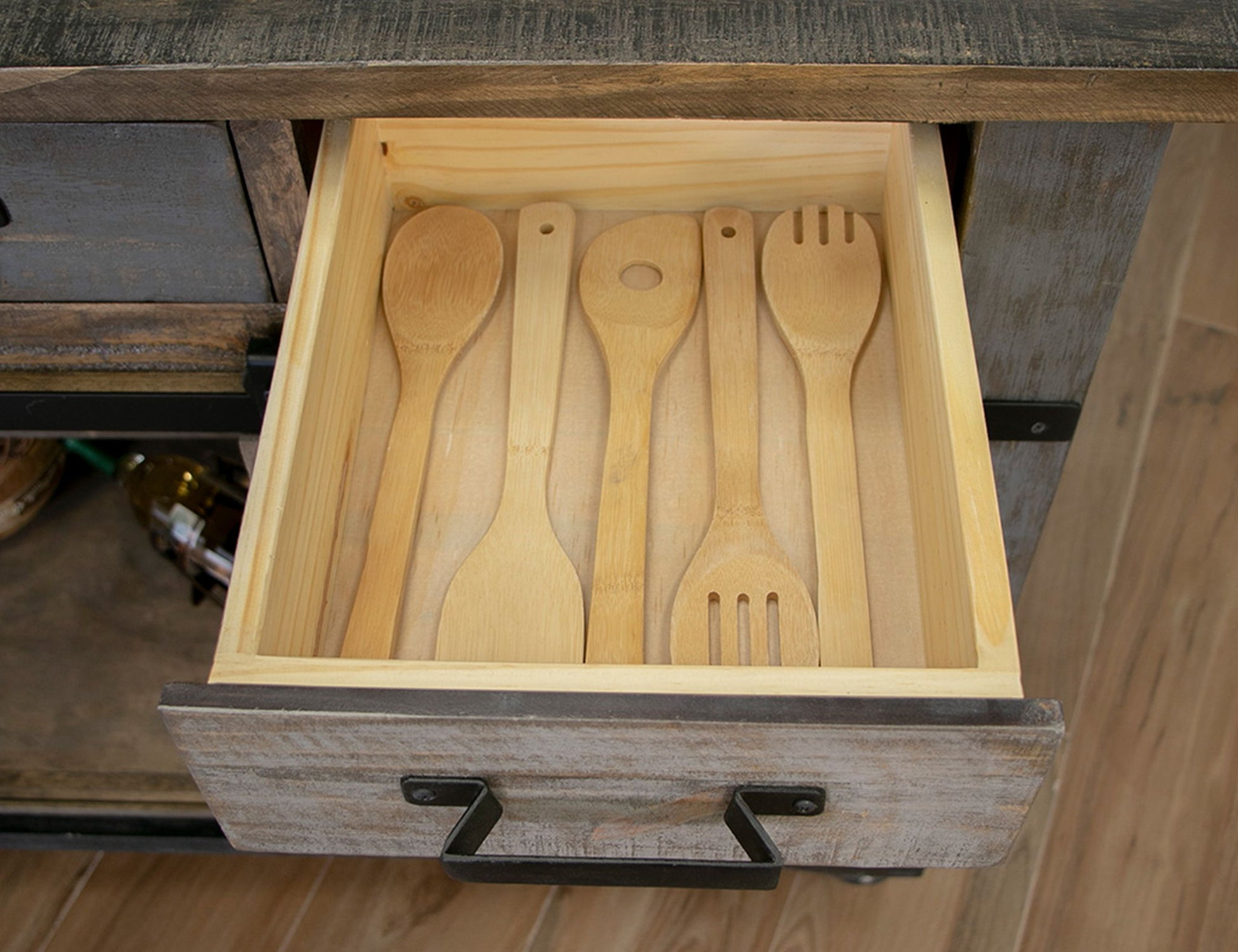 - Multi-step hand-painted water-based acrylic lacquer finish in gray and brown tones for an updated “reclaimed wood” look.