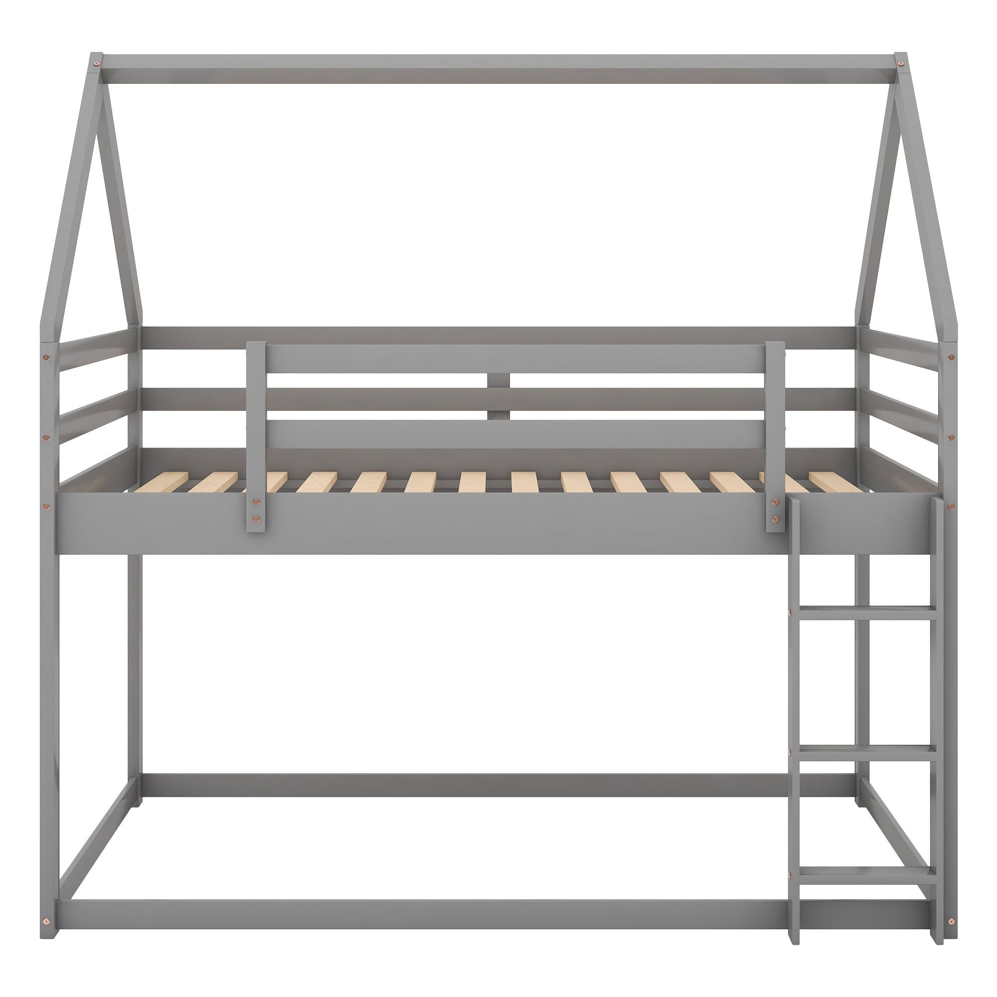 Twin Over Twin Low Bunk Bed With House Shaped Frame And Ladder - Gray