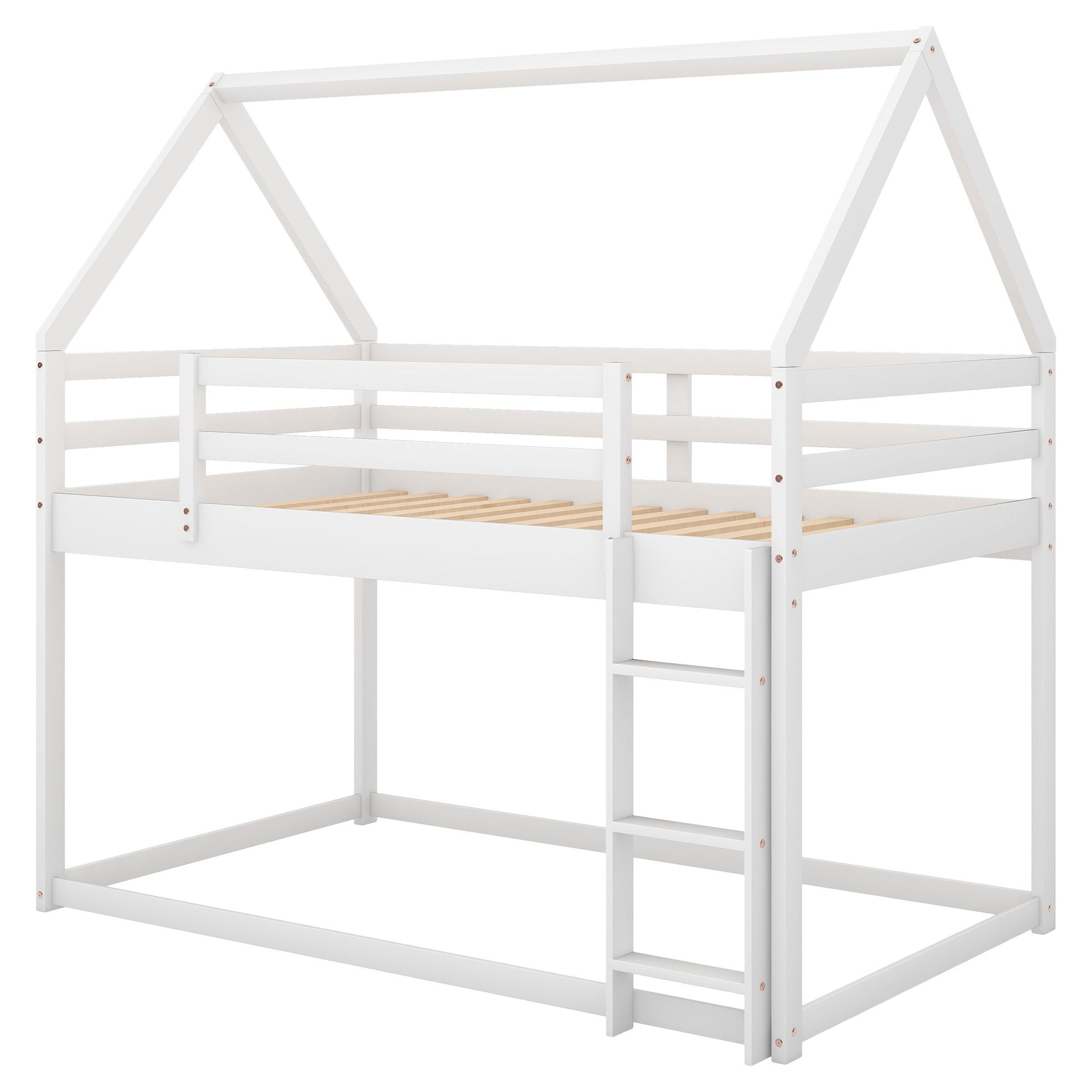 Twin Over Twin Low Bunk Bed, House Bed With Ladder - White
