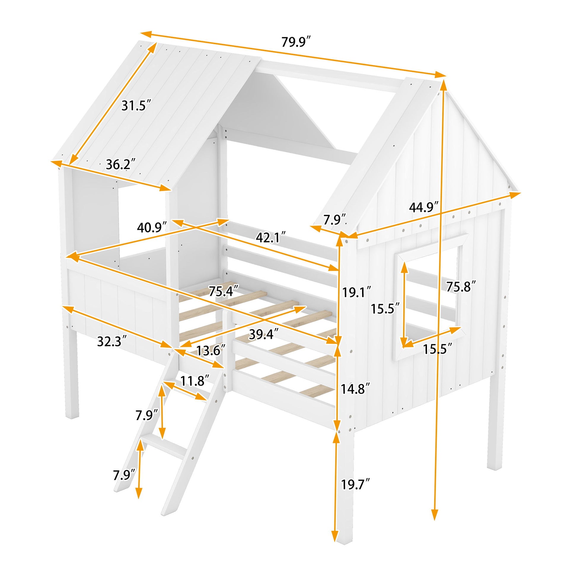 Twin Size Low Loft House Bed With Two Side Windows - White