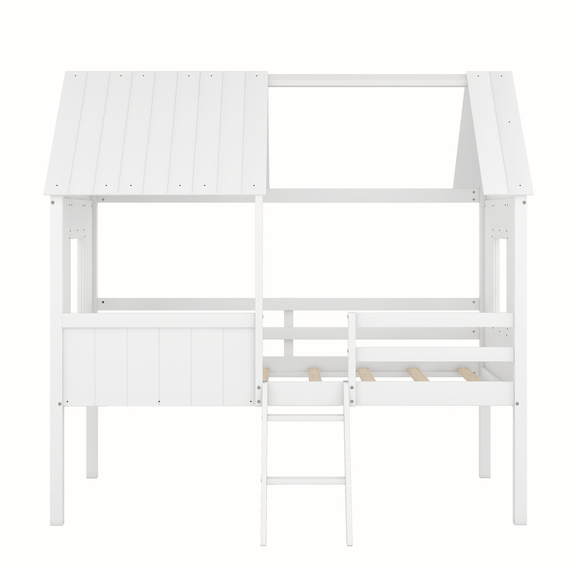 Twin Size Low Loft House Bed With Two Side Windows - White / Brown