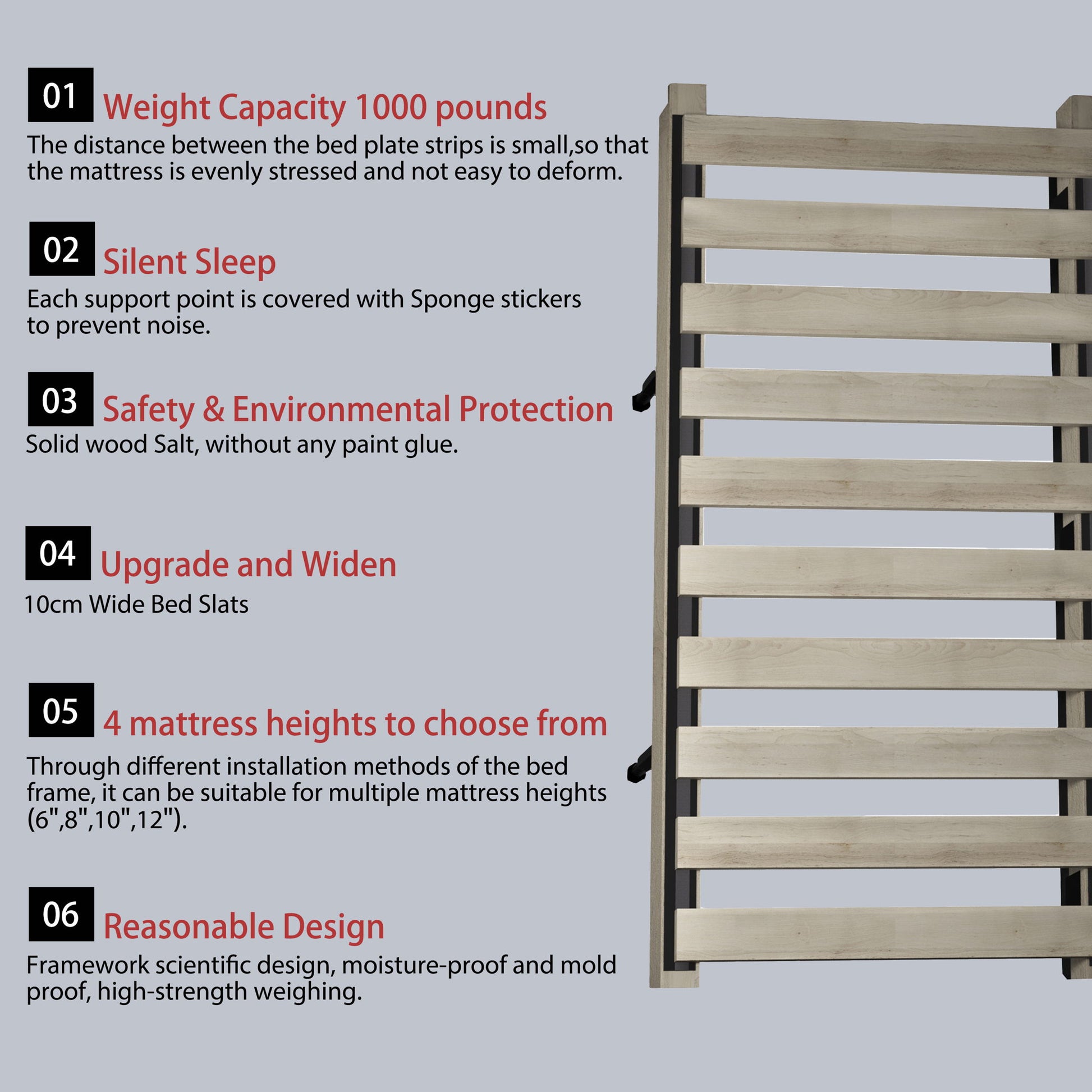 - Multiple heights of mattresses are available for selection: By installing the bed frame in different ways, it can adapt to different mattress heights (6 inches, 8 inches, 10 inches, 12 inches).