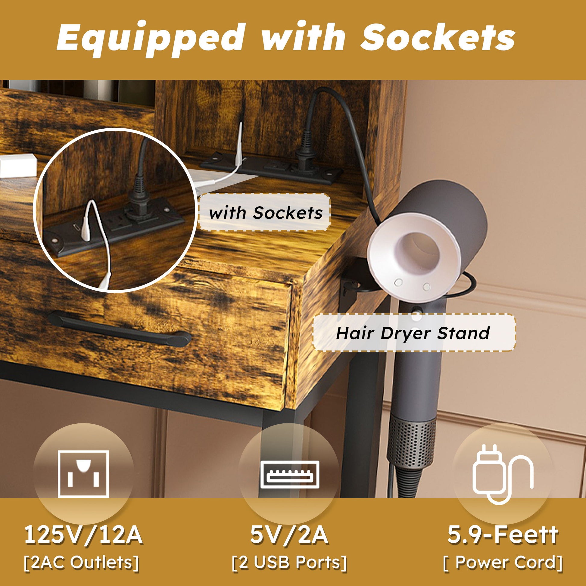 Makeup Vanity Table With LED Lights, 3 Color Options, Power Outlet - Brown