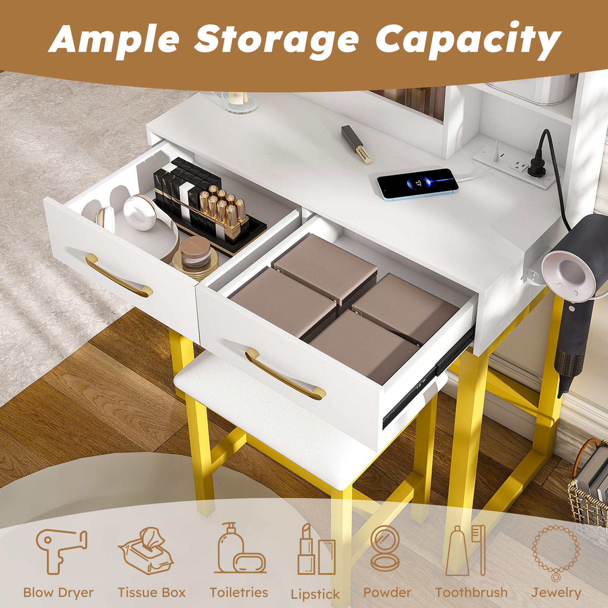 Modern Makeup Vanity Table With LED Lights, Power Outlet, And Metal Chair - White