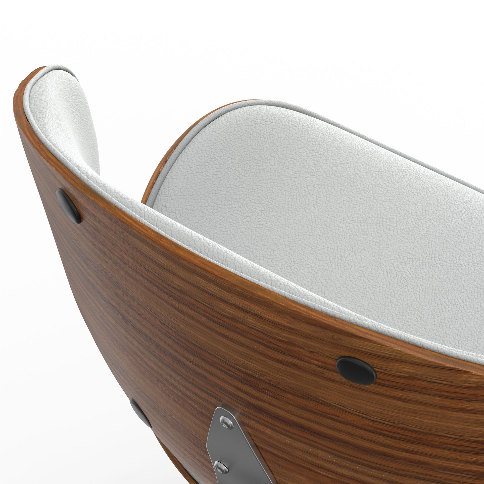 - Mid Century Modern design features comfortable curved padded seat and seat back, walnut veneer on bentwood frame, metal back support bar