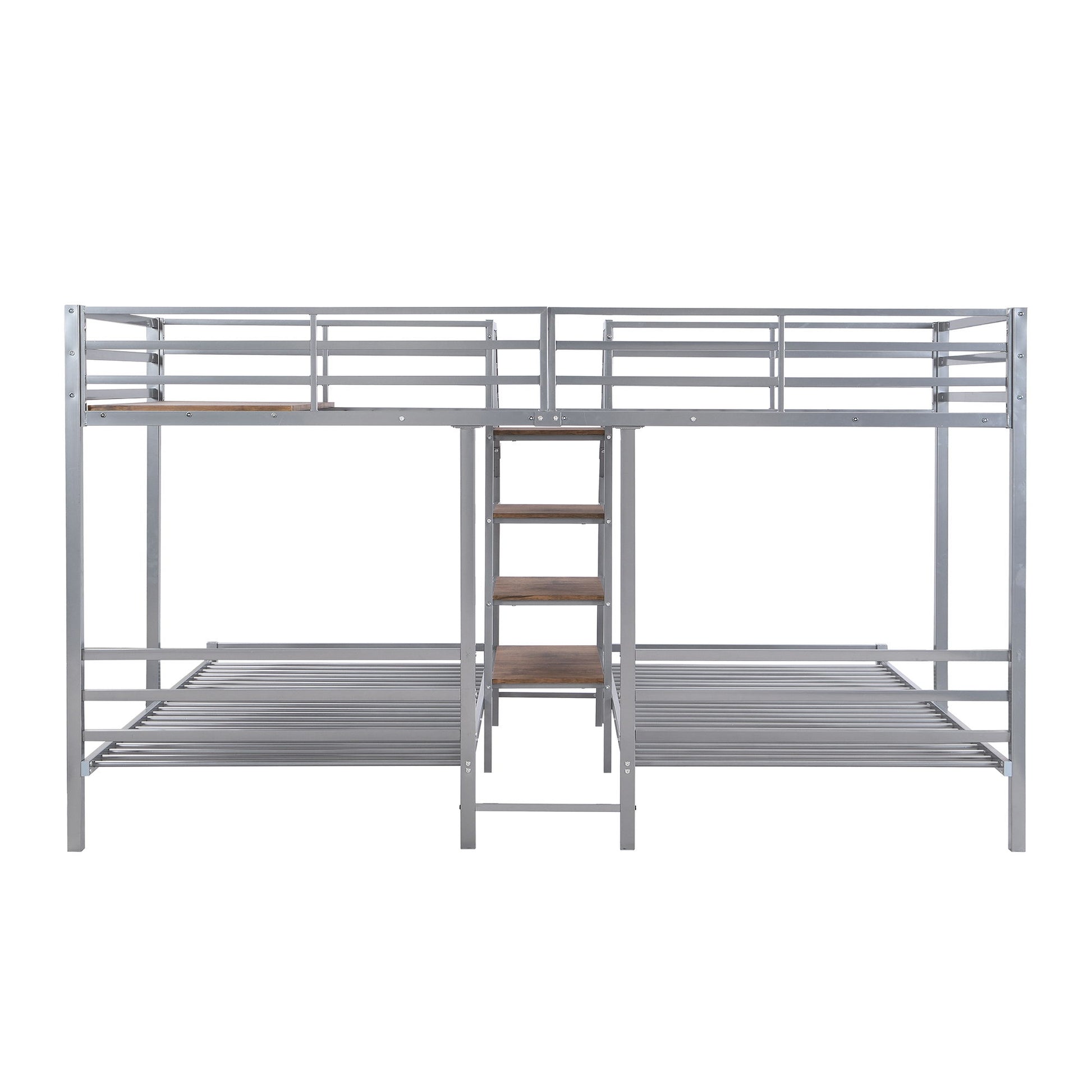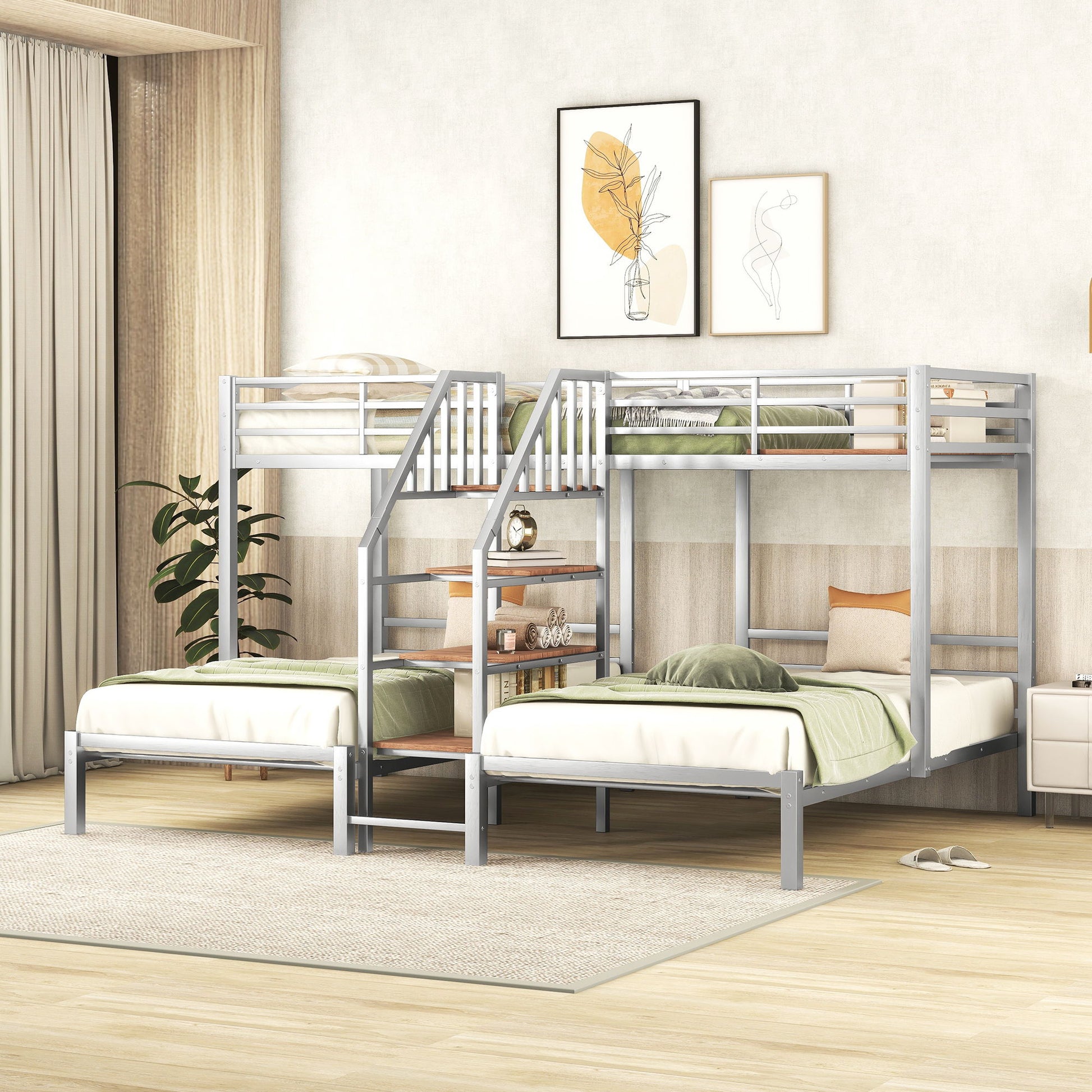 Twin Over Twin & Twin Bunk Bed With Storage Shelves And Staircase, 3 Deck Design - Silver