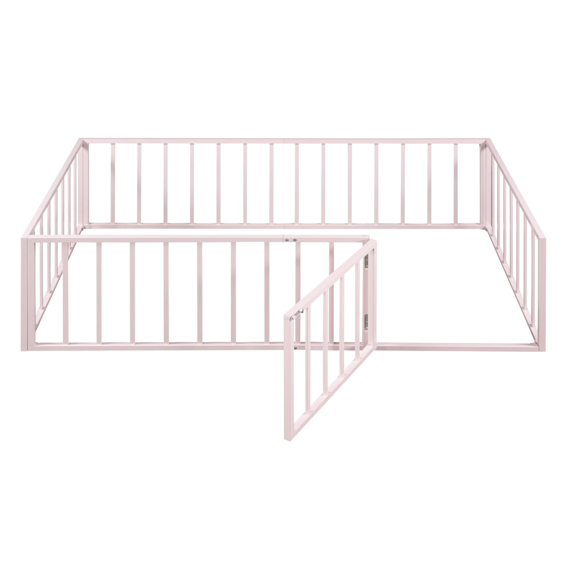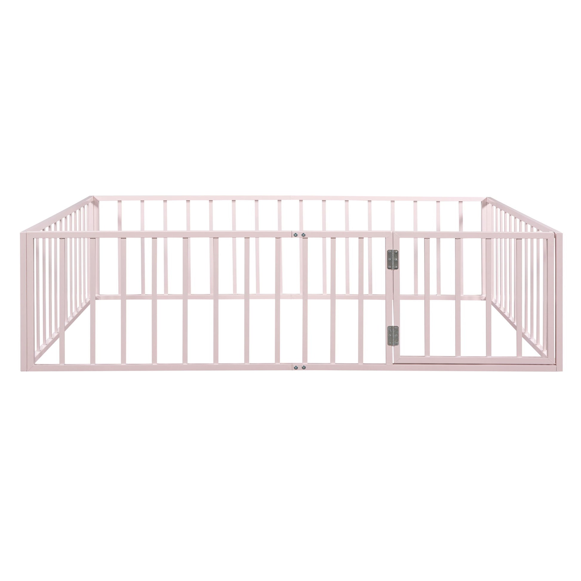 Queen Size Floor Bed Frame With Fence And Door - Pink