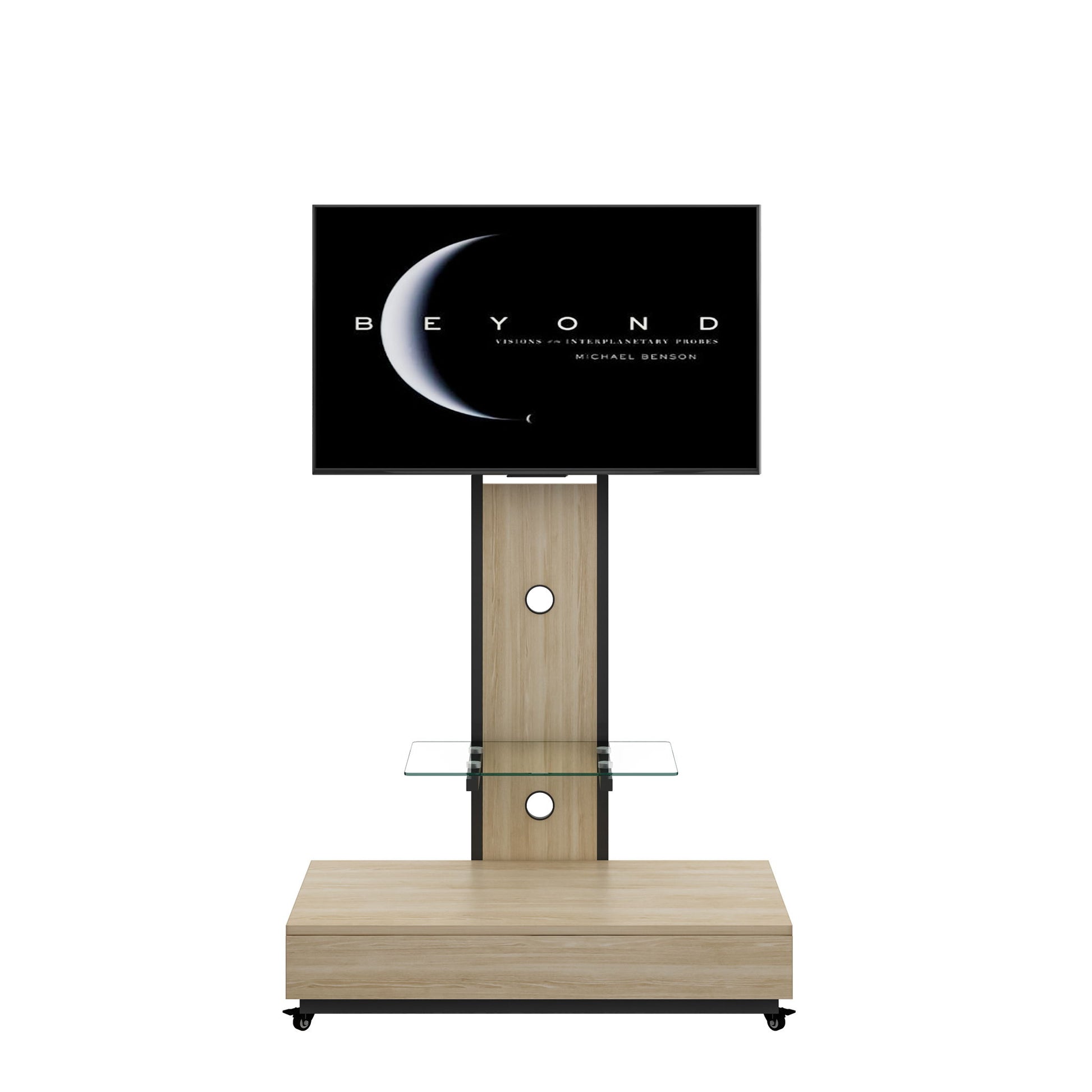 Mobile TV Cart With Push Pull Drawer For TVs Wood & Glass Stand With Lockable Wheels - Natural