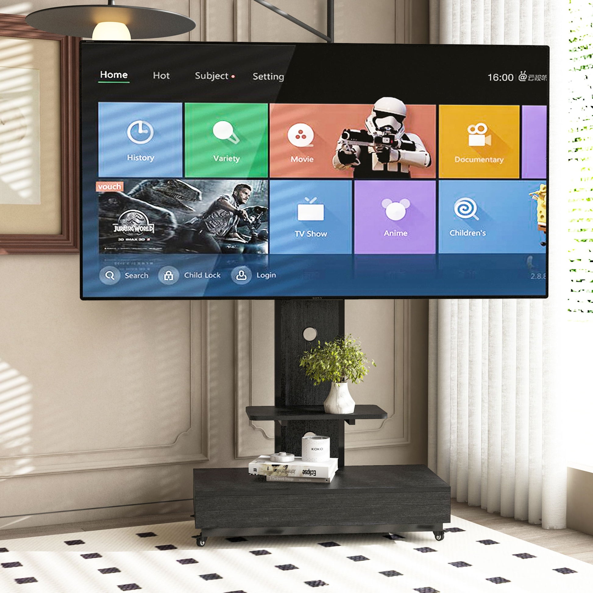Mobile TV Cart With Push Pull Drawer, Lockable Wheels