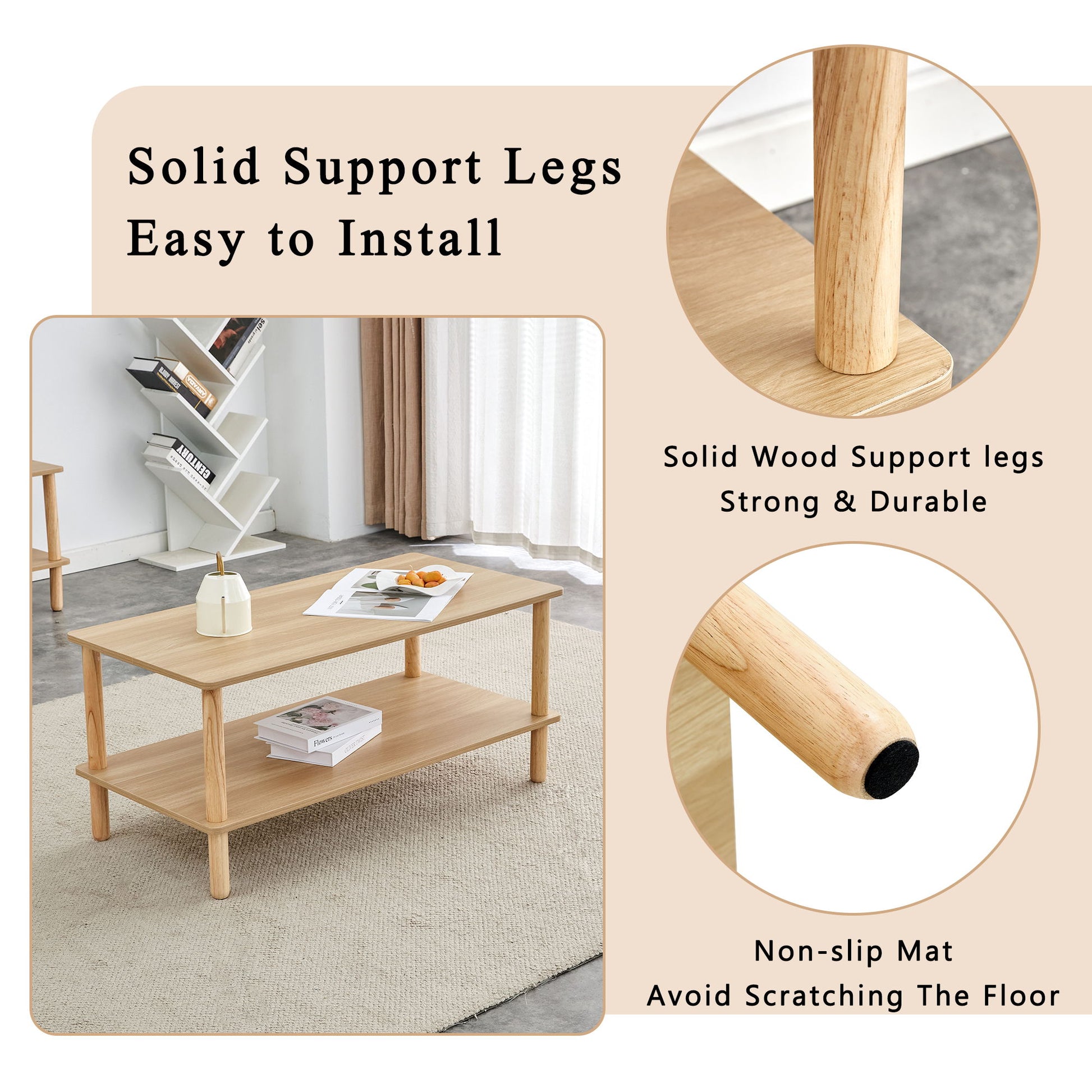 Modern 2 Tier Coffee Table For Living Room Furniture, Rectangular Center Table With Open Storage Shelf, Rounded Rubberwood Legs, Stable And Durable - Burly Wood