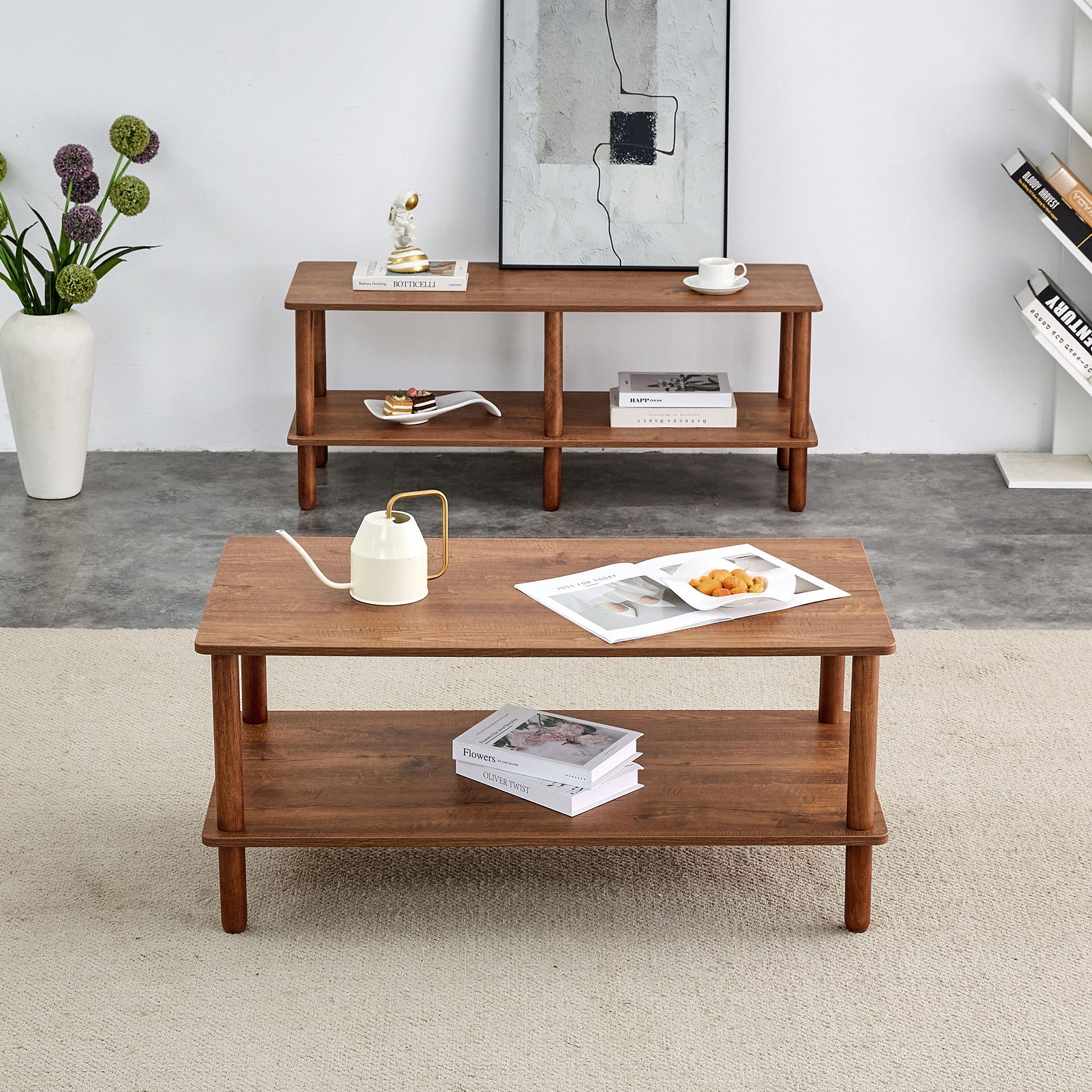 Modern 2 Tier Coffee Table For Living Room Furniture, Rectangular Center Table With Open Storage Shelf, Rounded Rubberwood Legs, Stable And Durable - Walnut