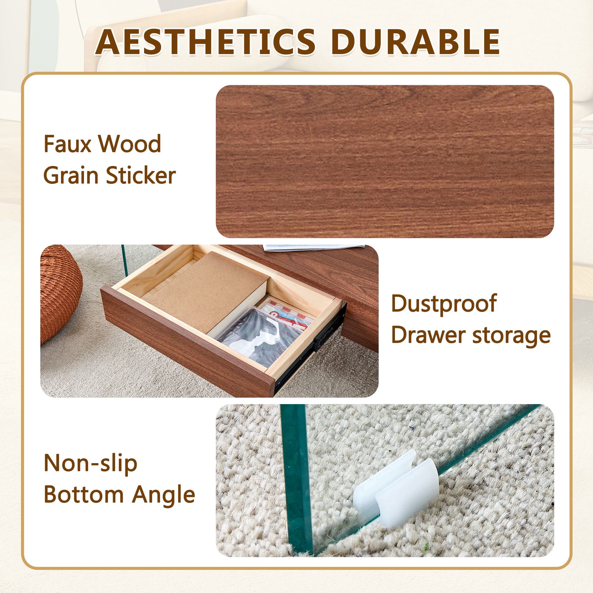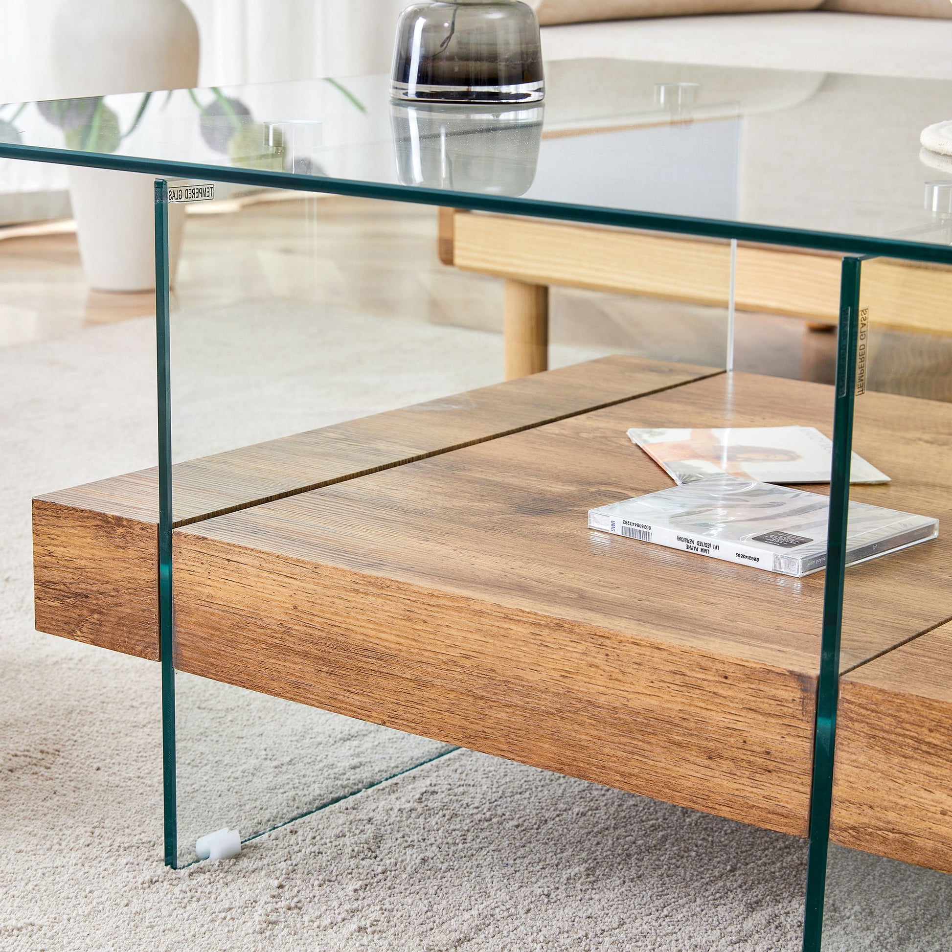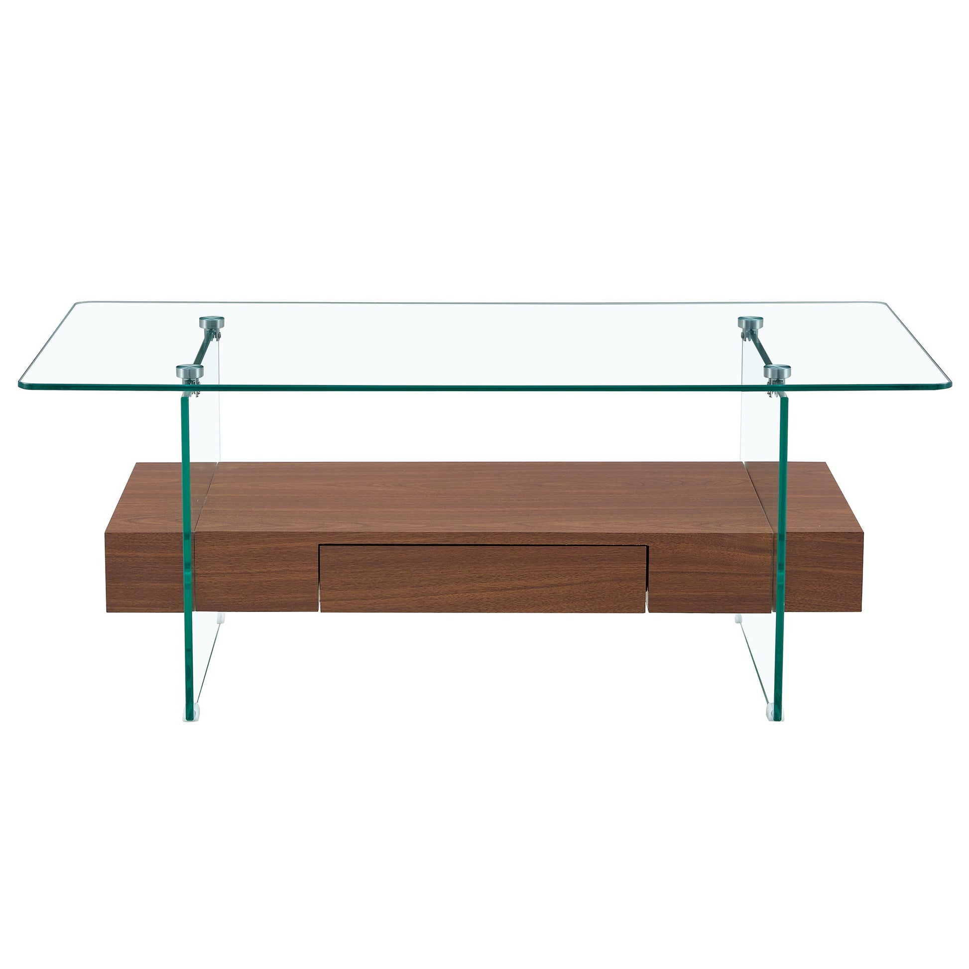 Modern 2 Tier Coffee Table With Drawer Clear Tempered Glass, Multifunctional Storage - Transparent / Wood