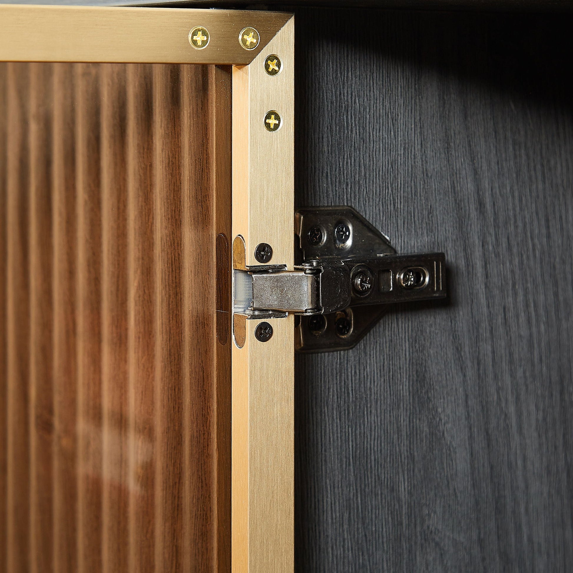 - High-Quality Construction: Made of particleboard, MDF, and tempered glass; features compression spring doors for a seamless appearance.