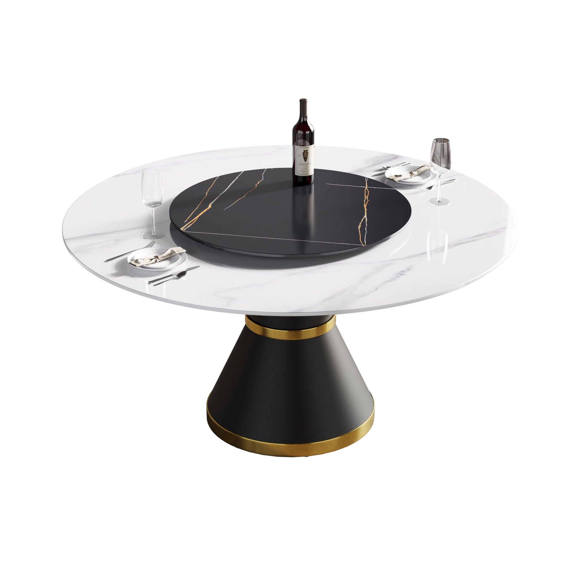 59.05" Modern Artificial Stone Round Carbon Steel Base Dining Table, Black Artificial Stone Turntable - White