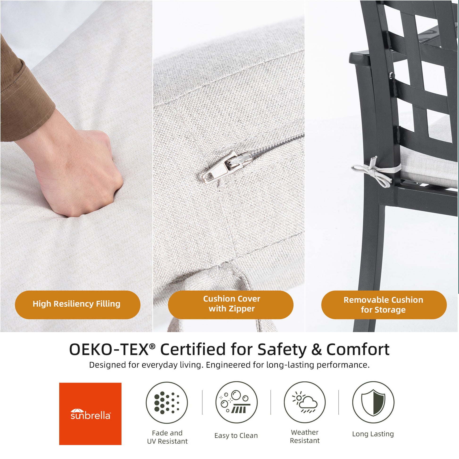- Removable Sunbrella Cushion: Features high-quality Sunbrella fabric in Cast Silver, known for durability, weather resistance, and easy cleaning with removable, zippered covers.