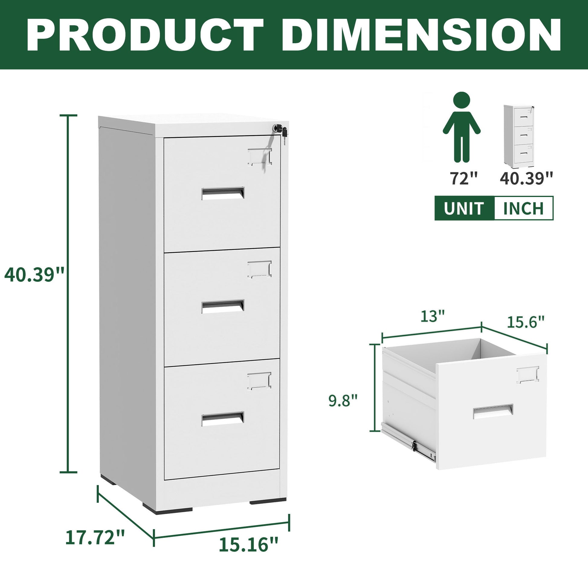 Metal Vertical File Cabinet With Lock And Card Slot For A4 Legal / Letter Size, Durable Steel, 3 Drawers - White