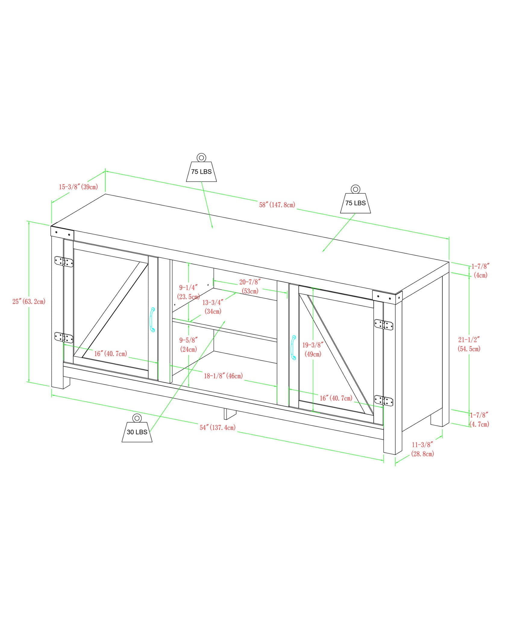 58.75"W x 15.5"D x 25.0"H - 87.0 lb