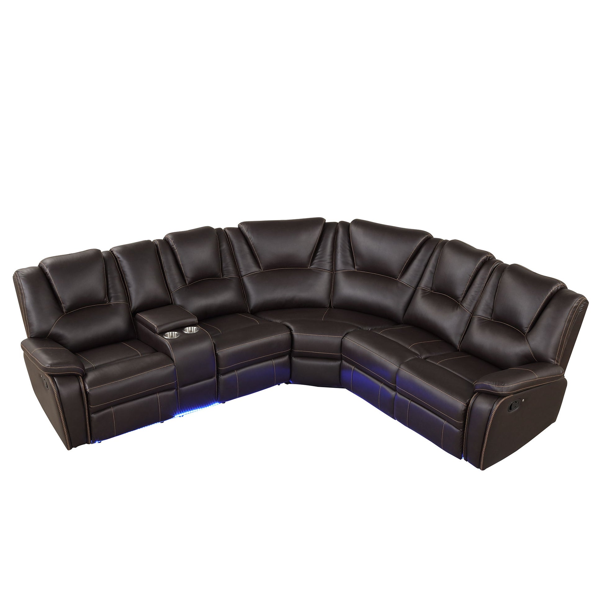 Modern Faux Leather Manual Reclining With Center Console And LED Light Strip, Living Room Furniture Set, PU Symmetrical Couch With 2 Cup Holders And Storage For Living Room