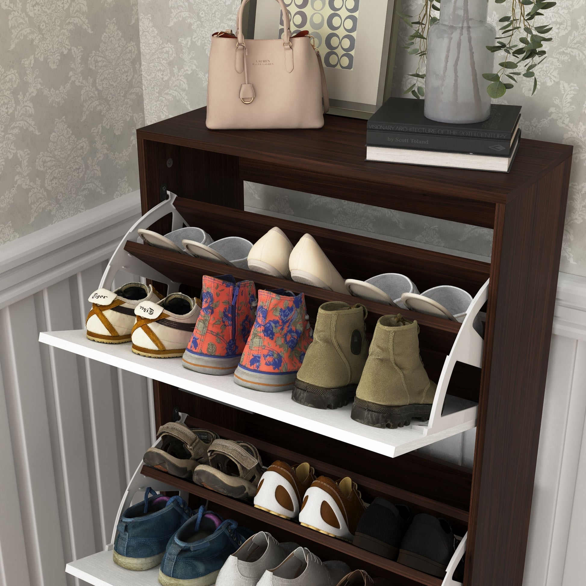 - Entryway Shoe Cabinet: Features 3 flip doors in a stylish & walnut finish, ideal for various home styles.